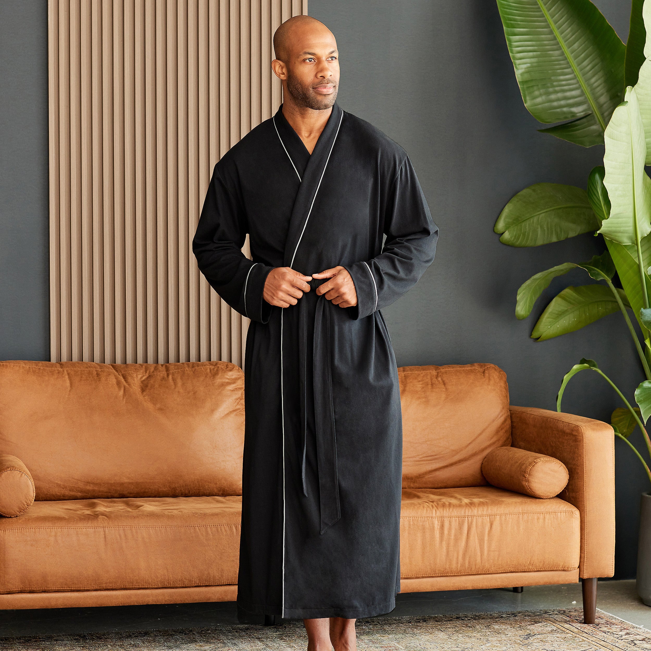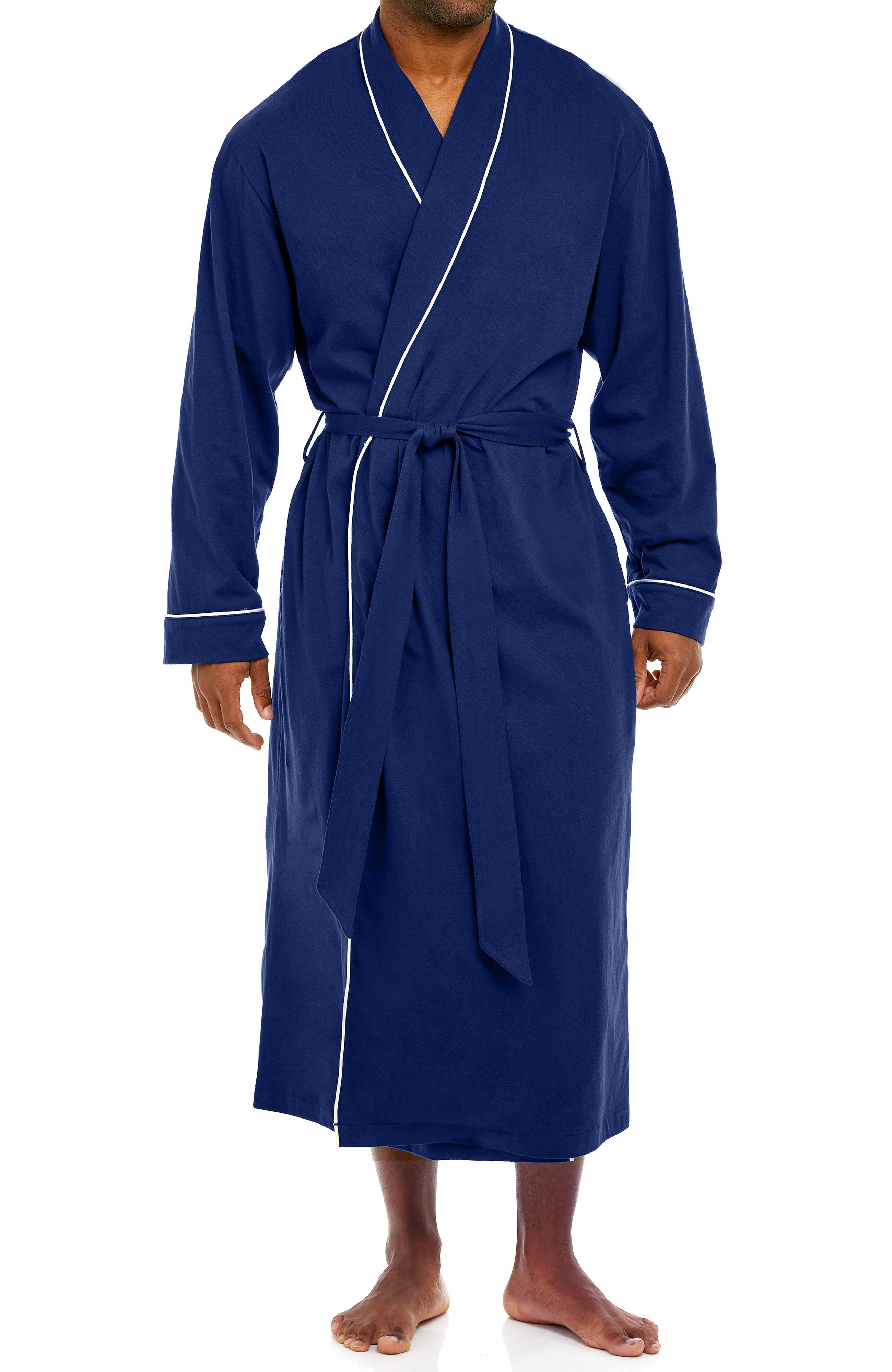 These men's bathrobes feature soft knit fabric that you'll no doubt love as much as we do! This mid-calf length, wrap around knit robe for men features a traditional shaw collar, cuffed sleeves and contrasting color piping throughout. Traditional wrap around belt outside, satin inner tie inside. Hidden inseam pockets deep enough for a large smart phone. Hem is double folded and mid-calf in length.