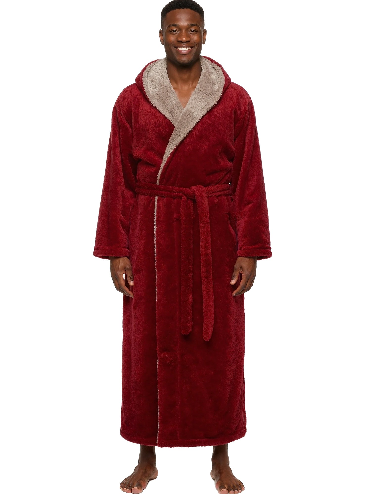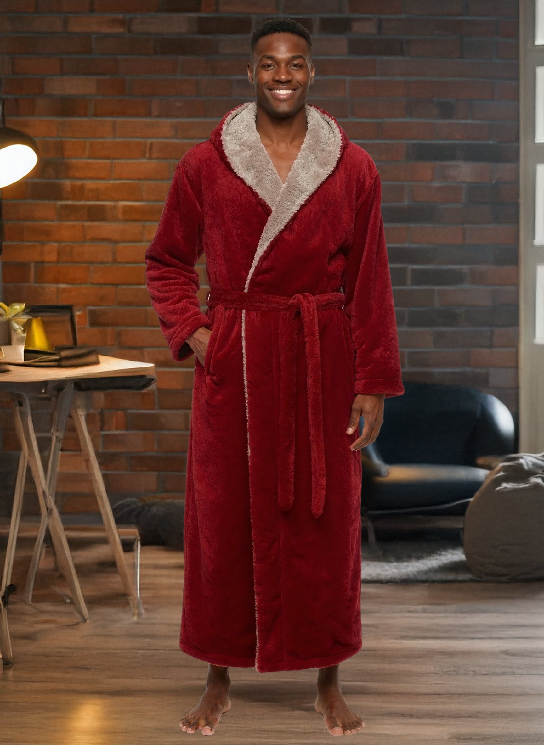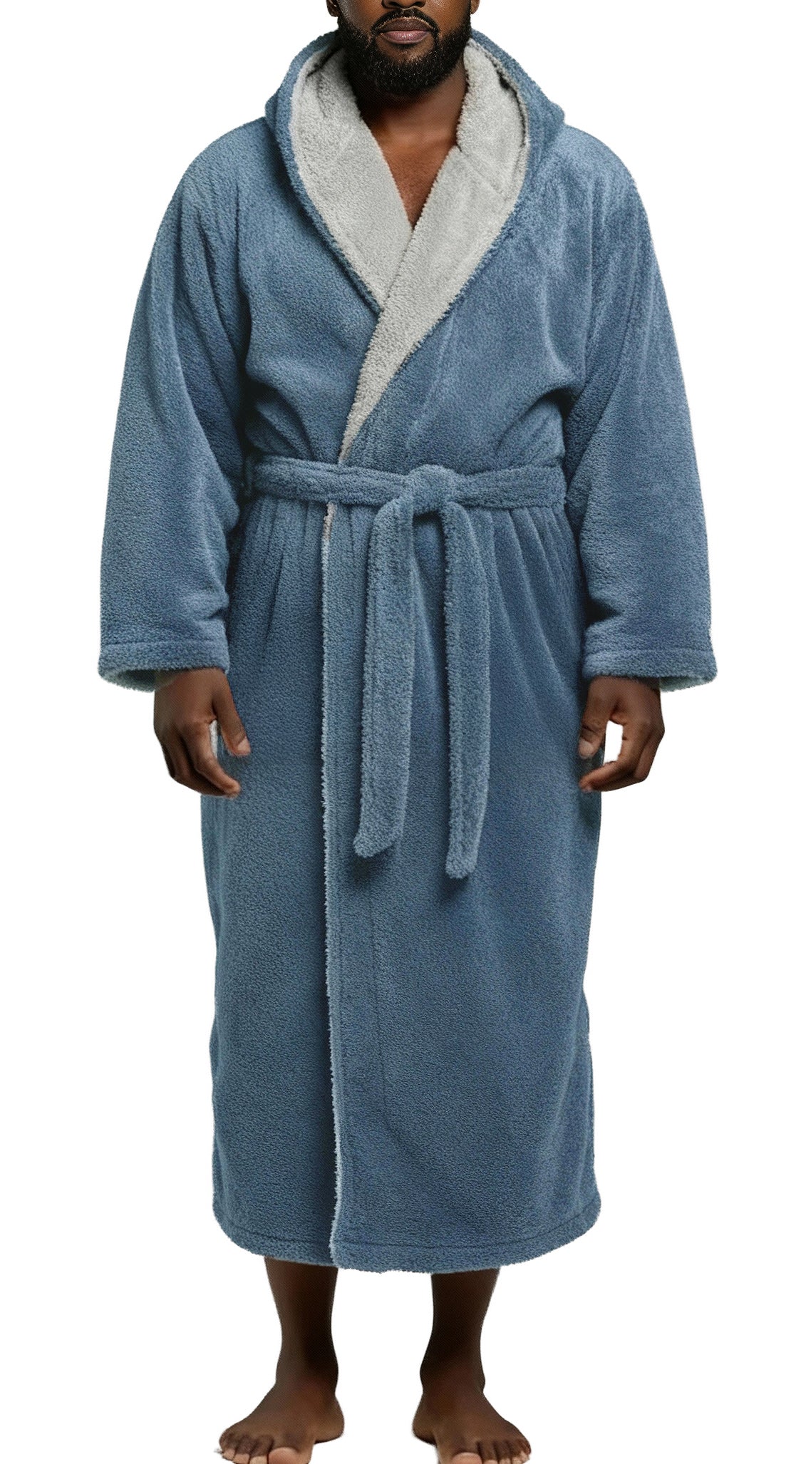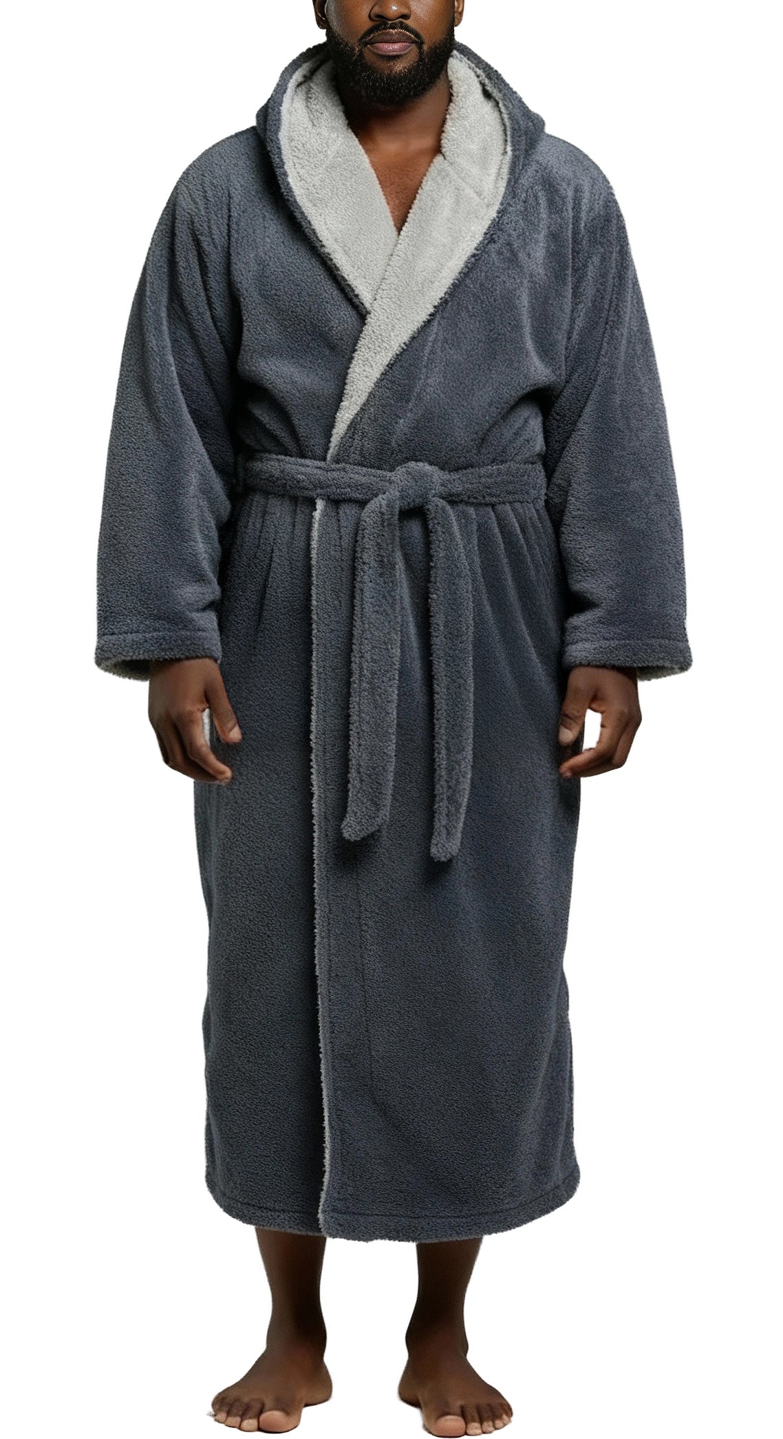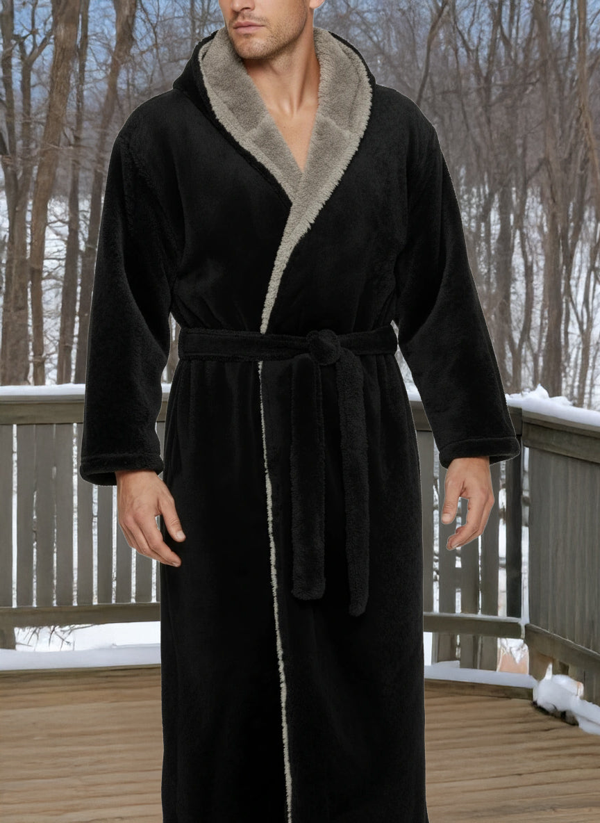 Wrap yourself in pure comfort with this men’s sherpa fleece bathrobe — your new go-to favorite for chilly winter mornings and lazy nights. Crafted from premium fleece fabric, this fluffy robe is softer and thicker than standard fleece, offering that same cozy feeling as petting your favorite furry companion. Designed to keep the cold air out, it’s warm, durable, and resistant to pilling or shedding. Stay cozy from head to toe with its full-length, hooded design. The large double-layer hood keeps your head, neck, and ears snug while you lounge, read, or nap. The removable belt stays securely attached on one side so you’ll never misplace it, while an inner tie closure ensures a secure, personalized fit. No more silly patch pockets on the front of the robe that nobody really likes, now there's two roomy side pockets for convenience and usability: perfect for warming your hands or keeping essentials close. Whether you’re relaxing at home, working remotely, or stepping outside on a brisk morning, this long, sherpa-lined robe wraps you in lasting comfort. Customers rave about the bathrobe’s perfect length, high-quality stitching, and the fluffy, warm texture that’s never bulky. It’s a thoughtful winter gift for dads, husbands, or friends — a hooded robe so soft and cozy, it feels like a hug on a cold day.