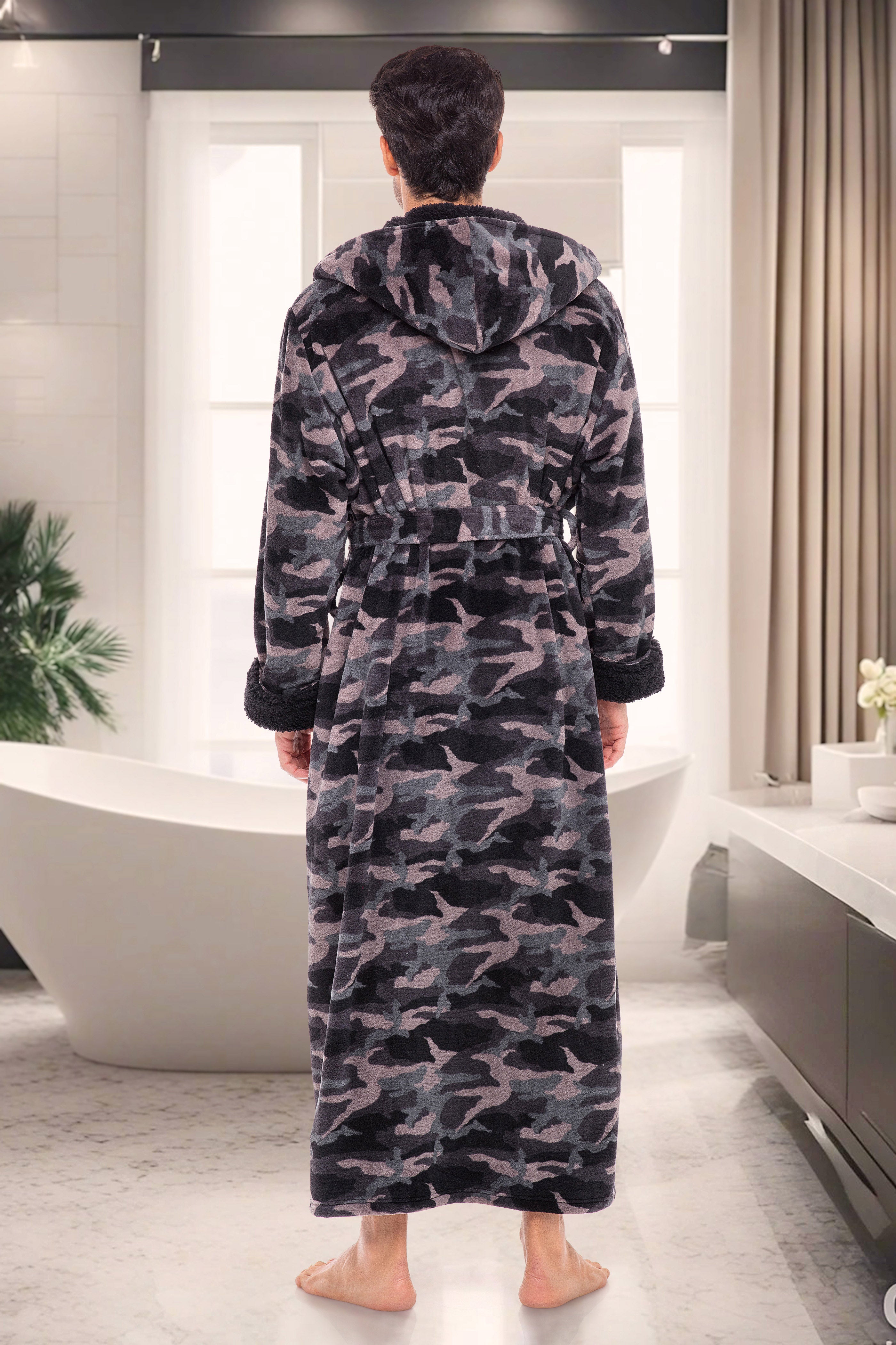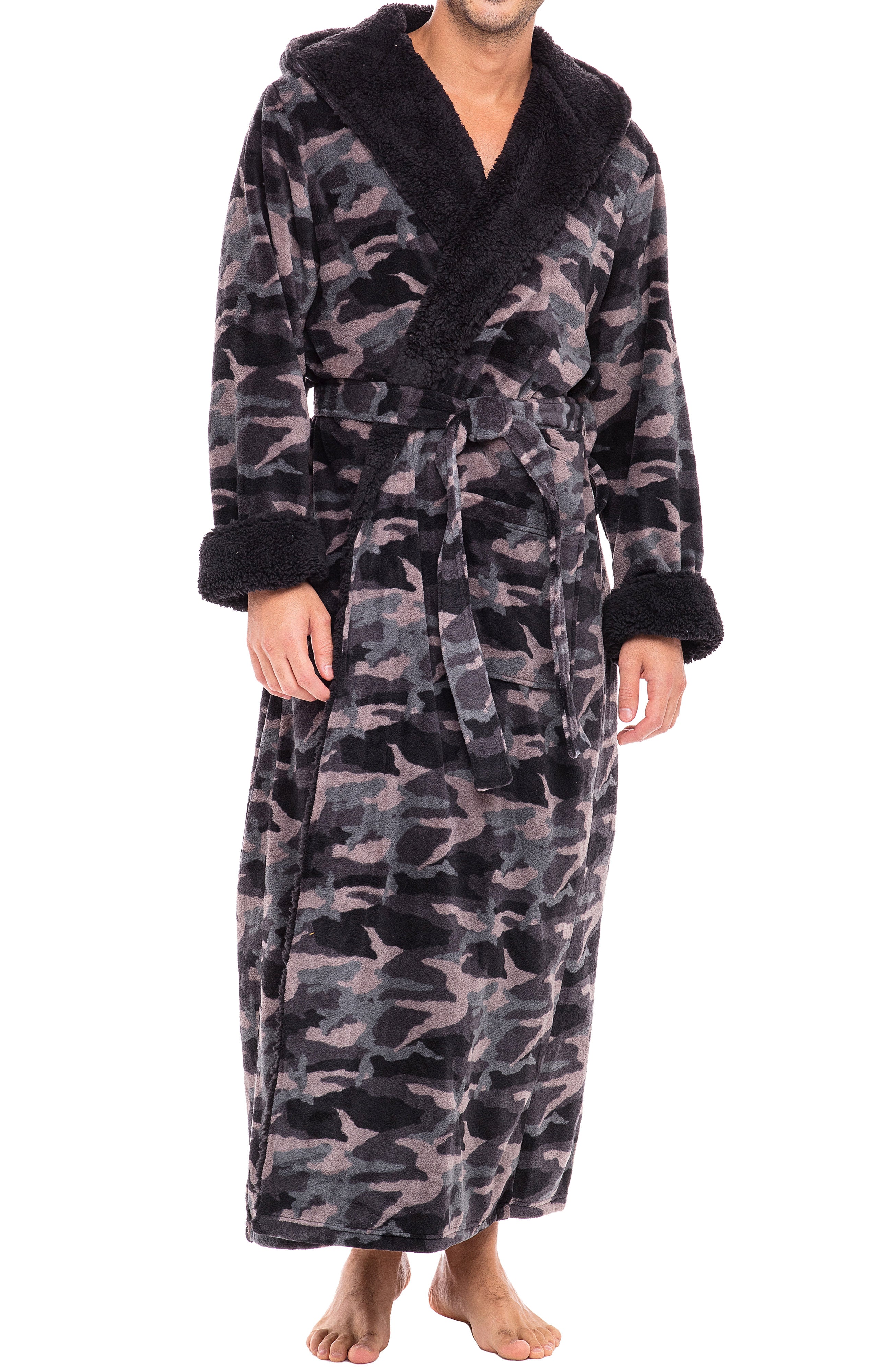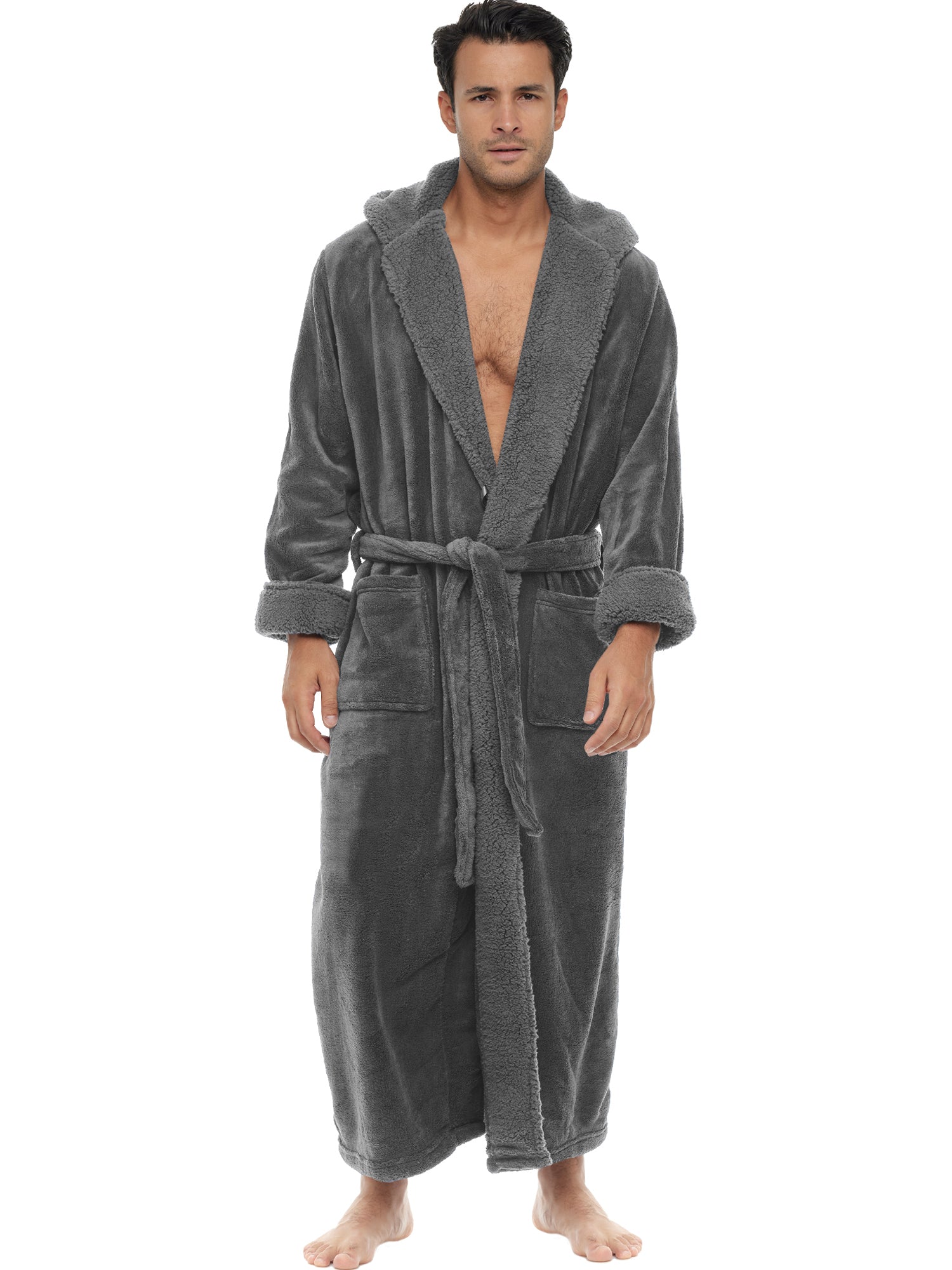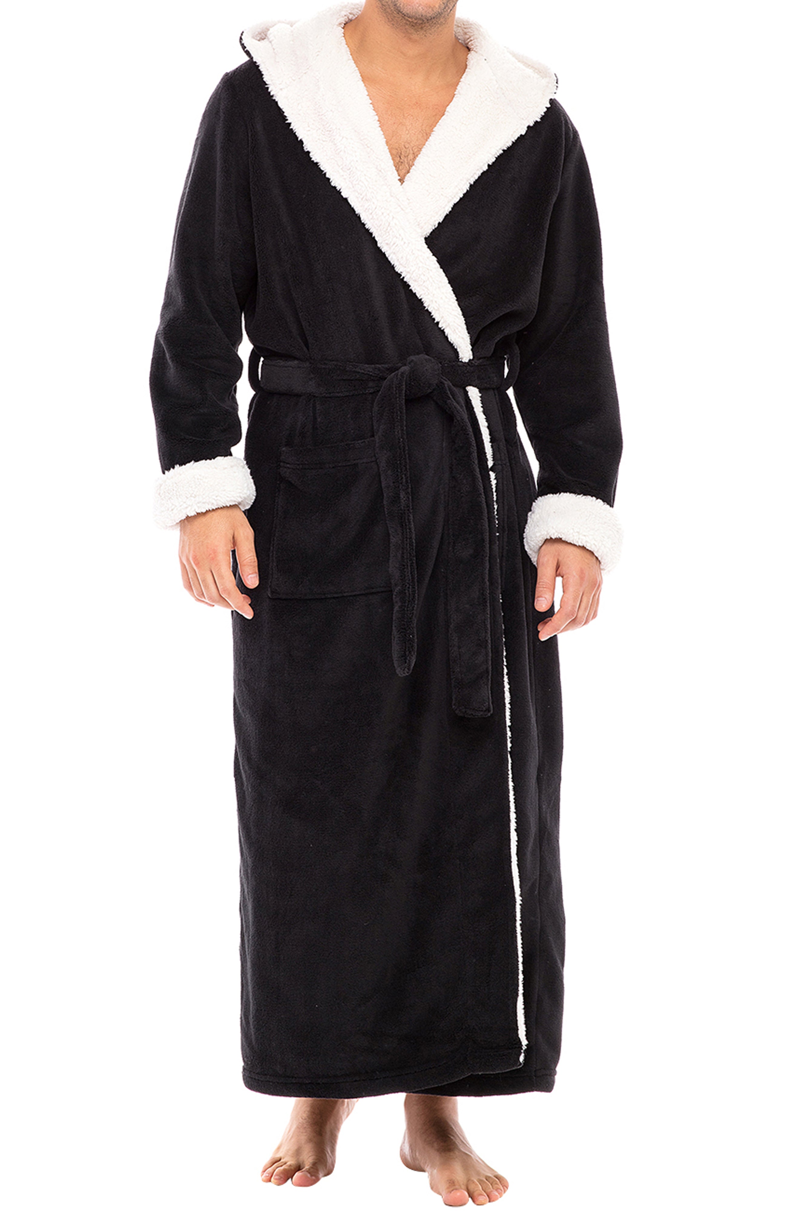 Men’s Long Hooded Sherpa Robe, Hooded Big and Tall Plush Fleece Hoodie Bathrobe