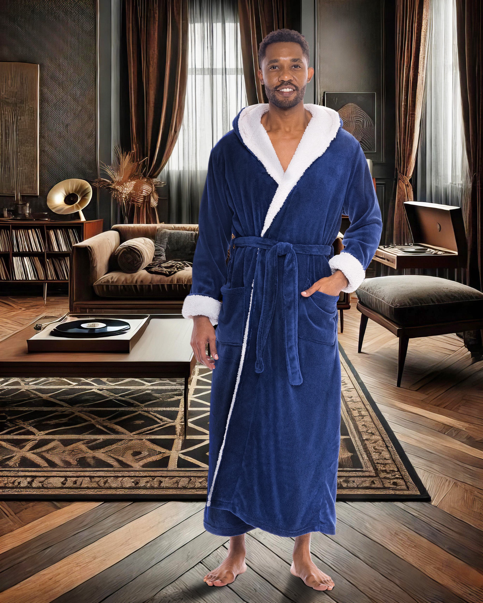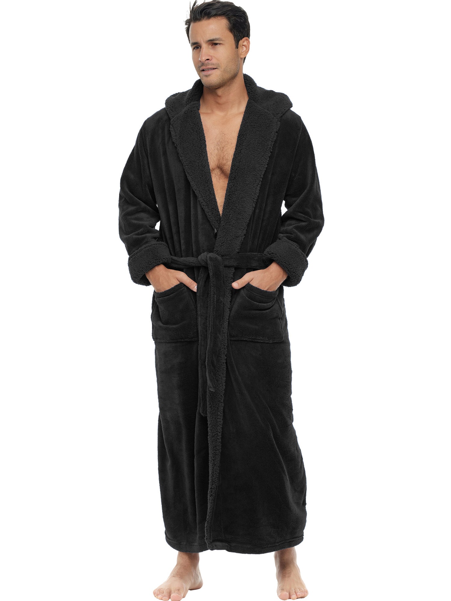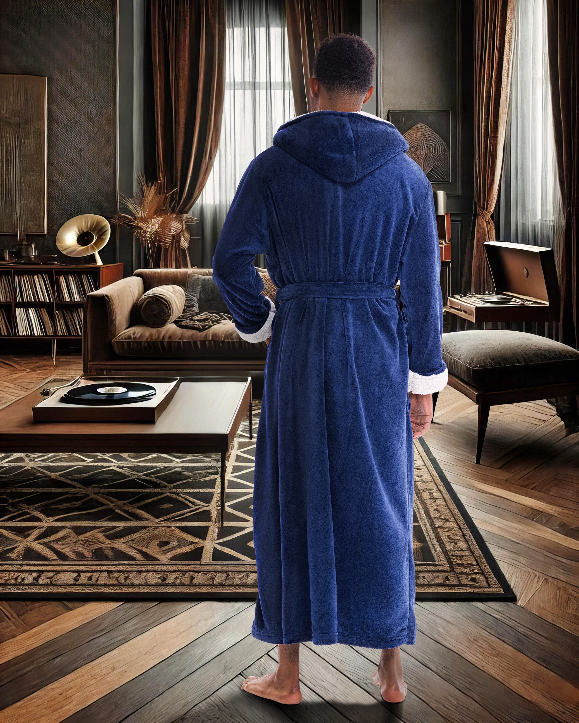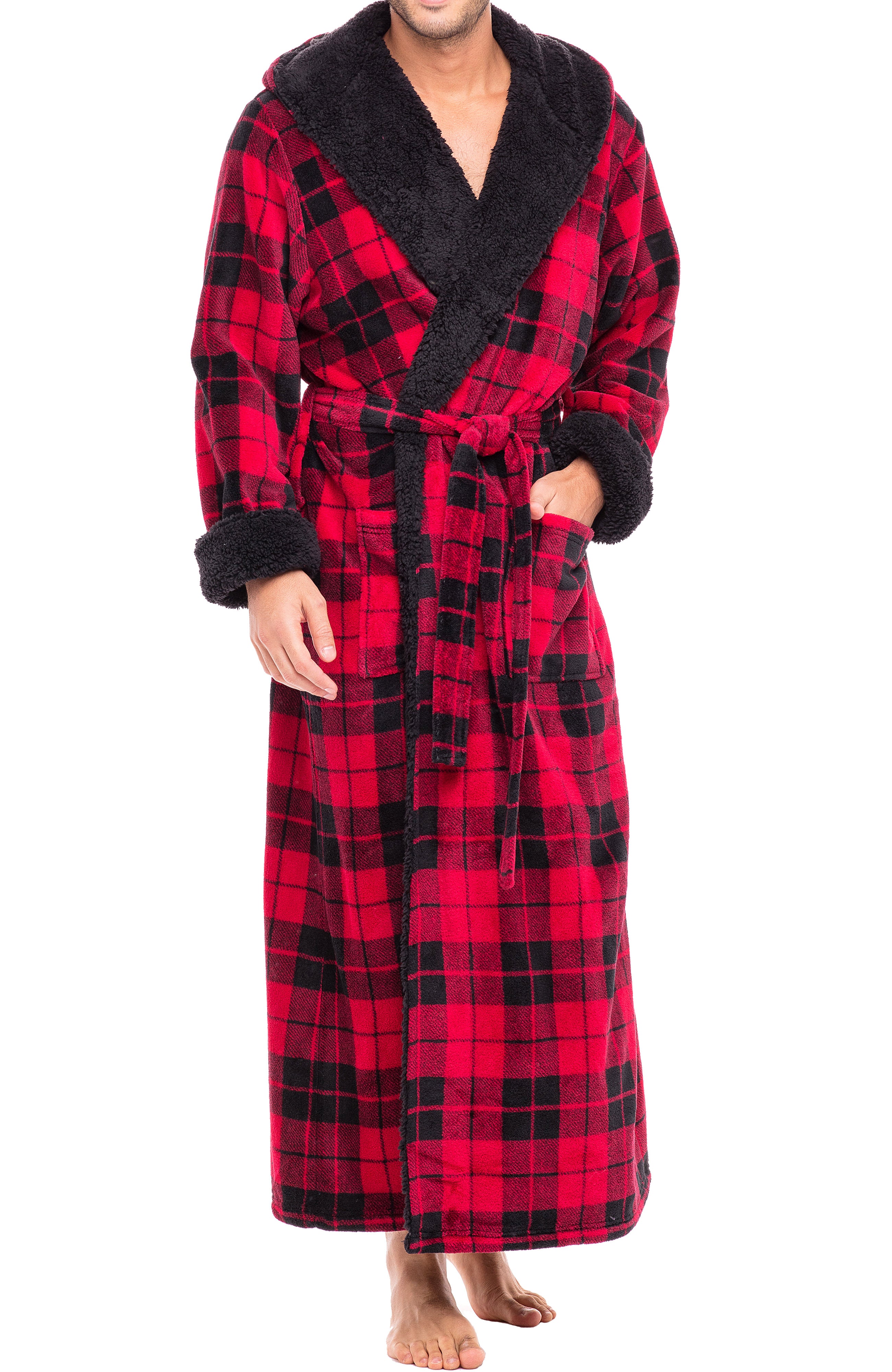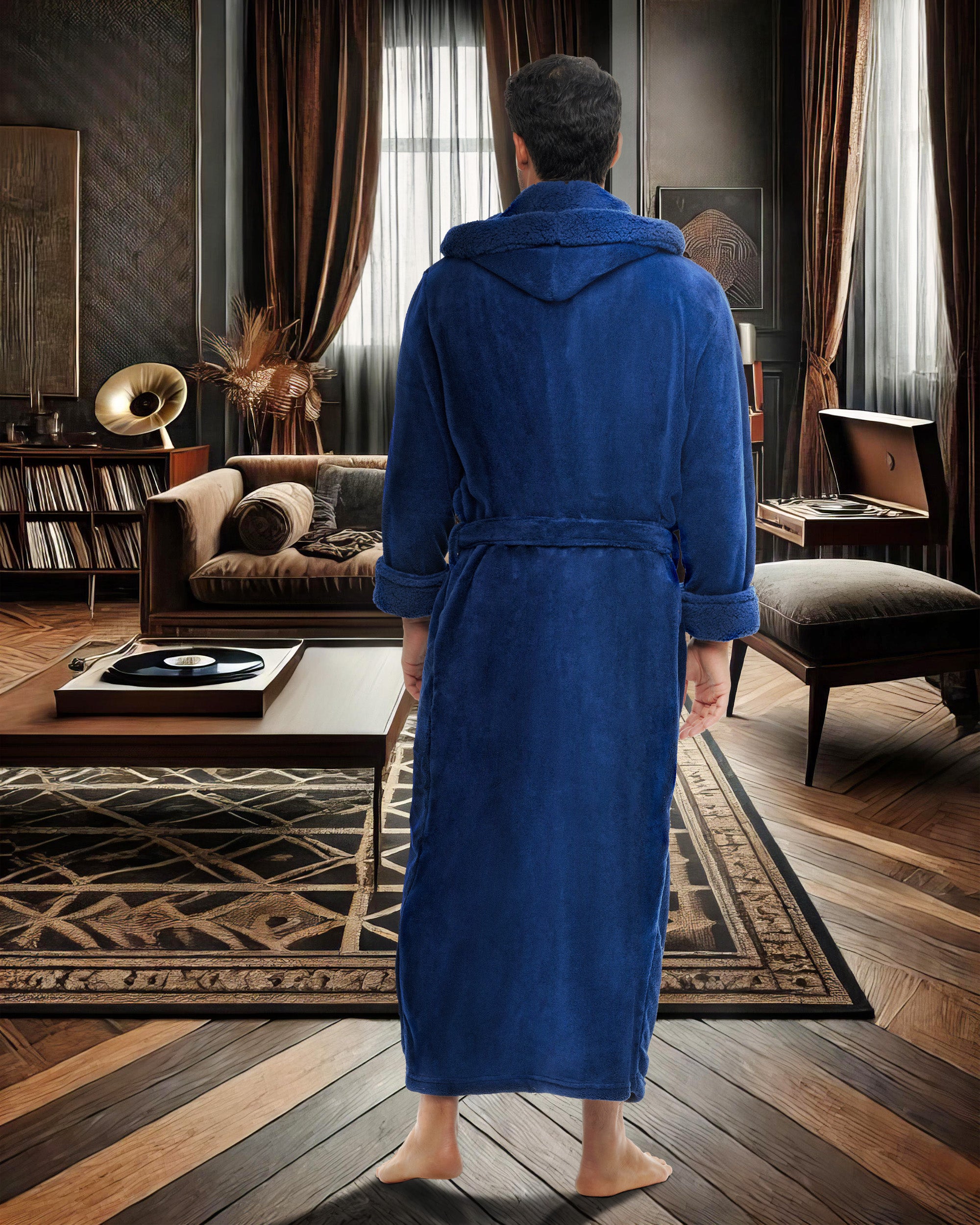 Men’s Long Hooded Sherpa Robe, Hooded Big and Tall Plush Fleece Hoodie Bathrobe