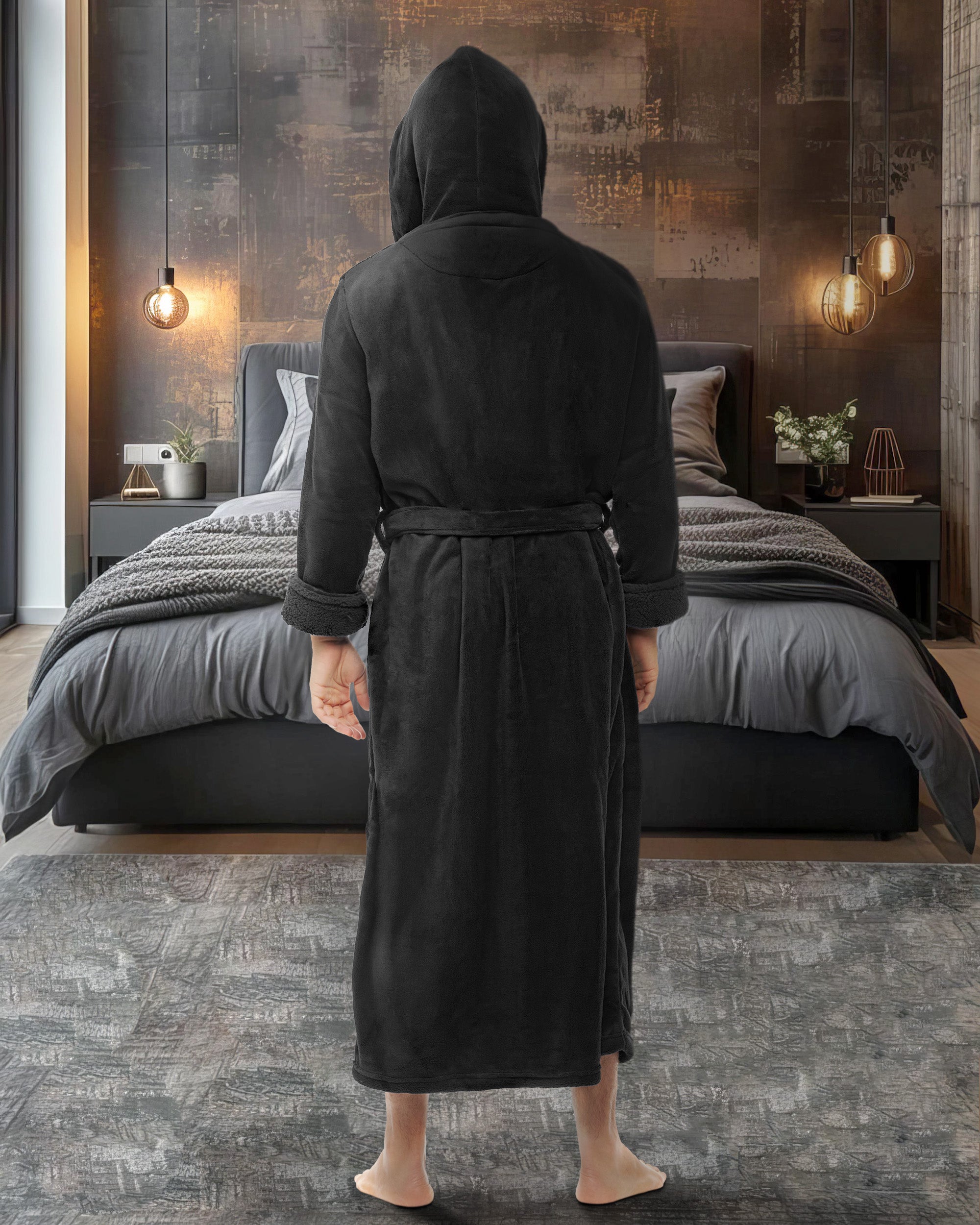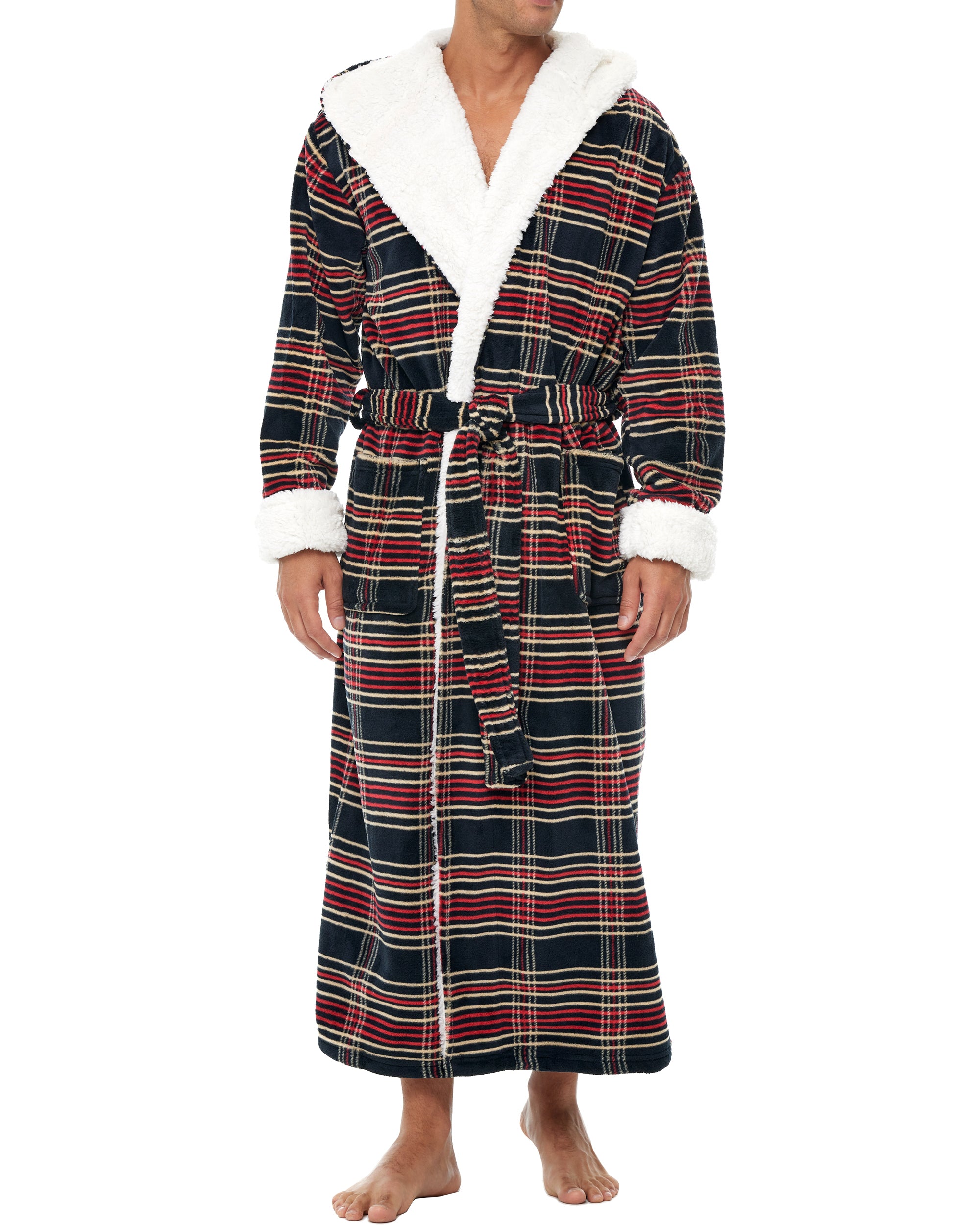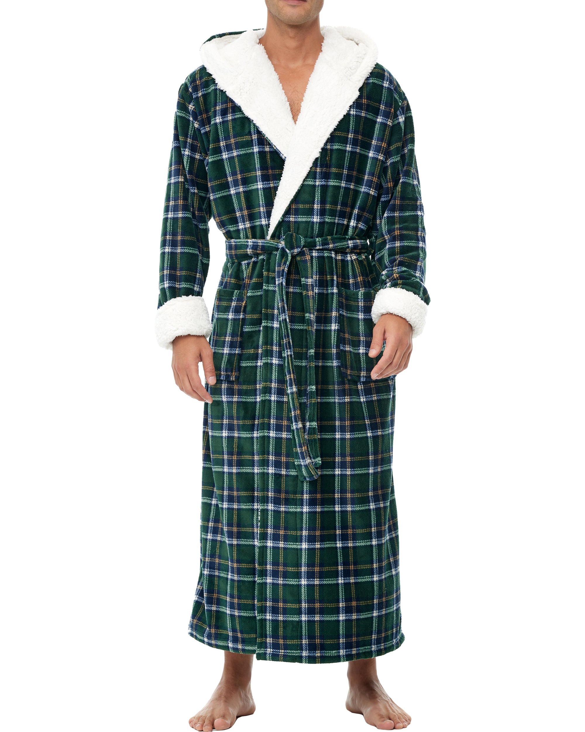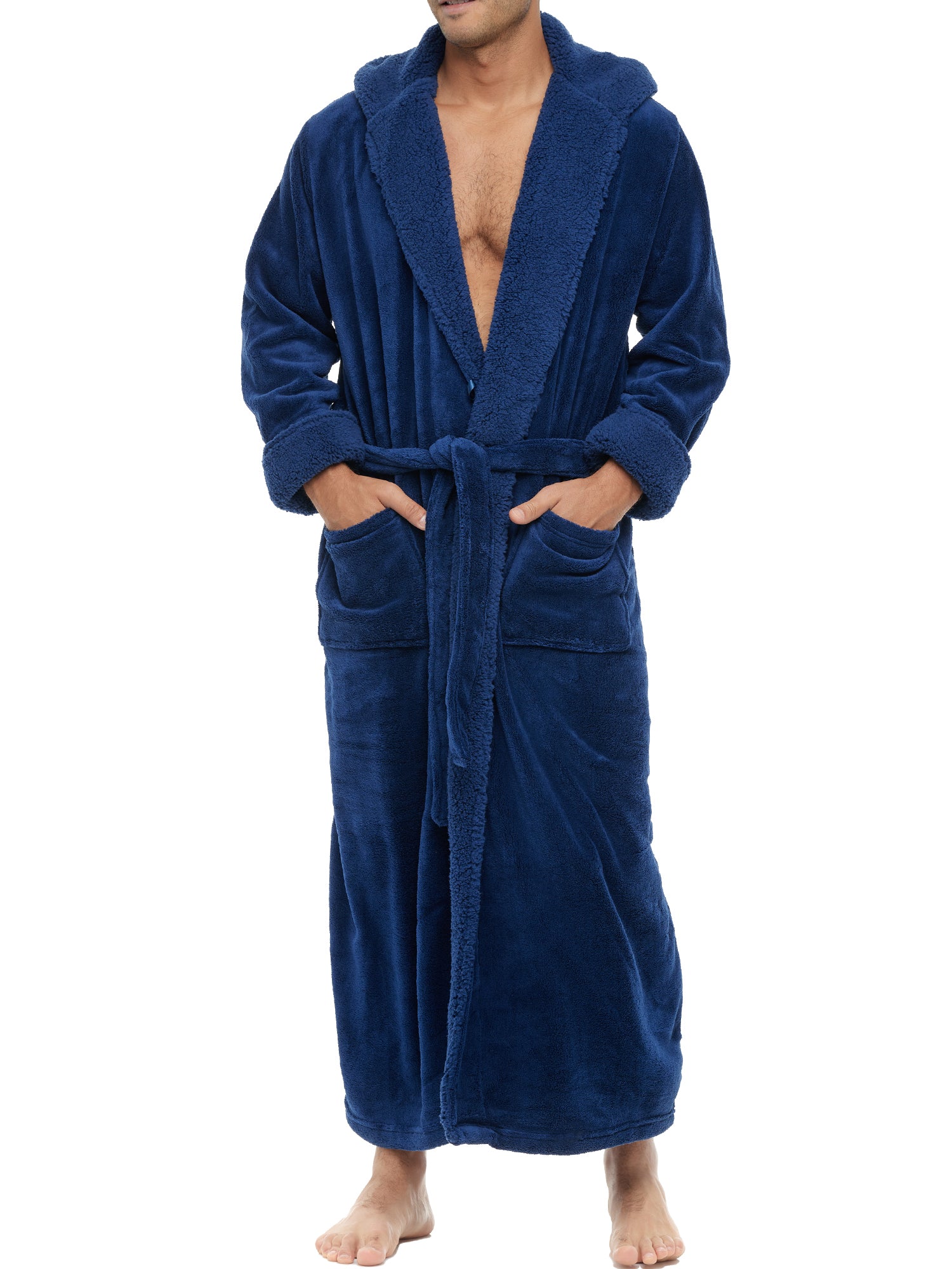 Men’s Long Hooded Sherpa Robe, Hooded Big and Tall Plush Fleece Hoodie Bathrobe