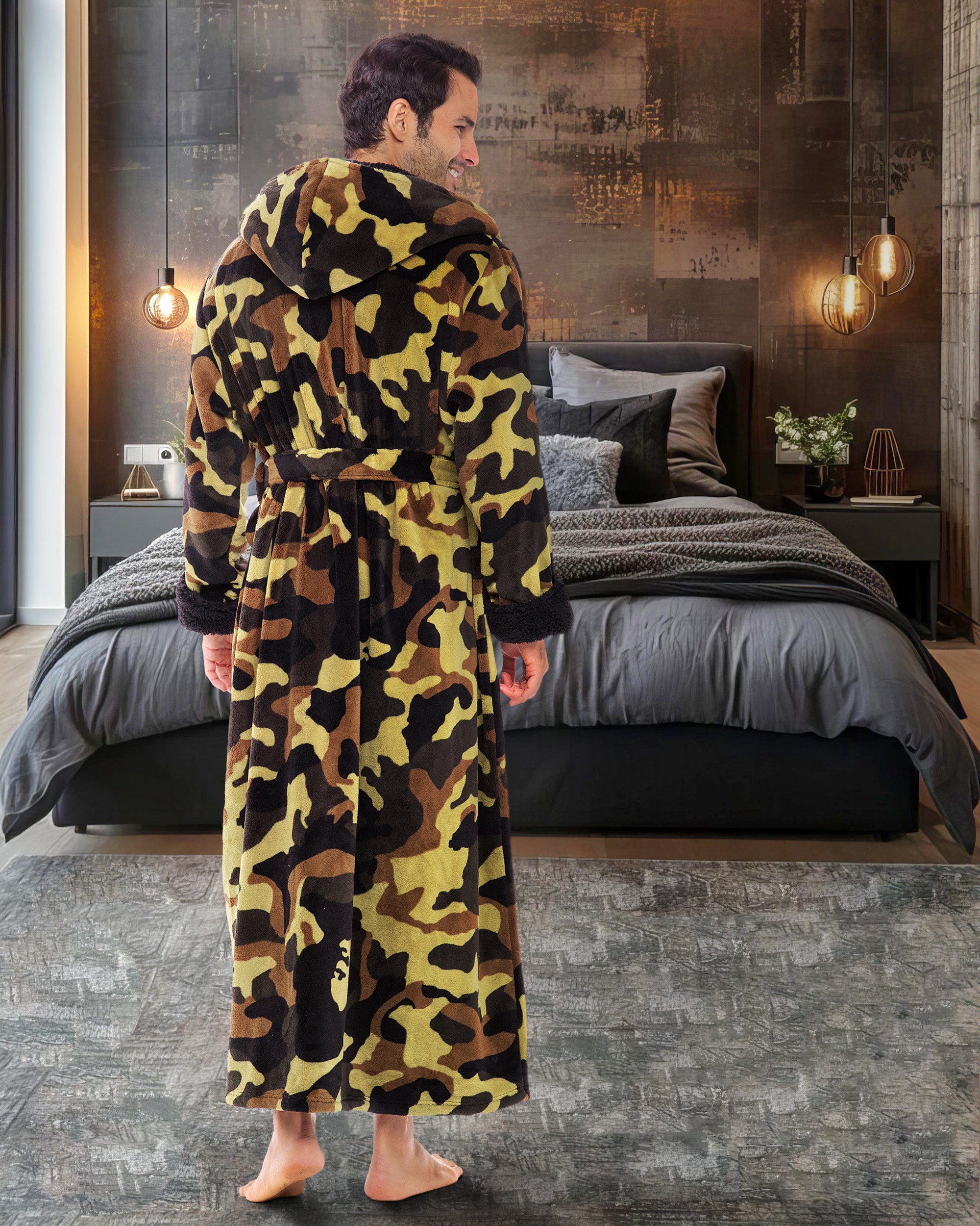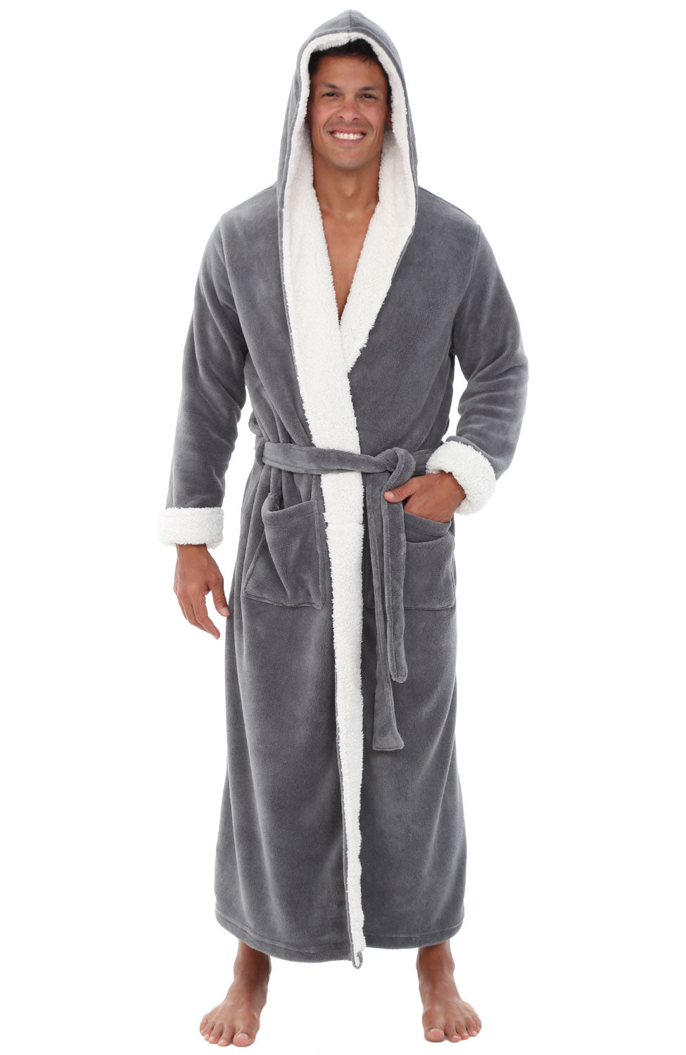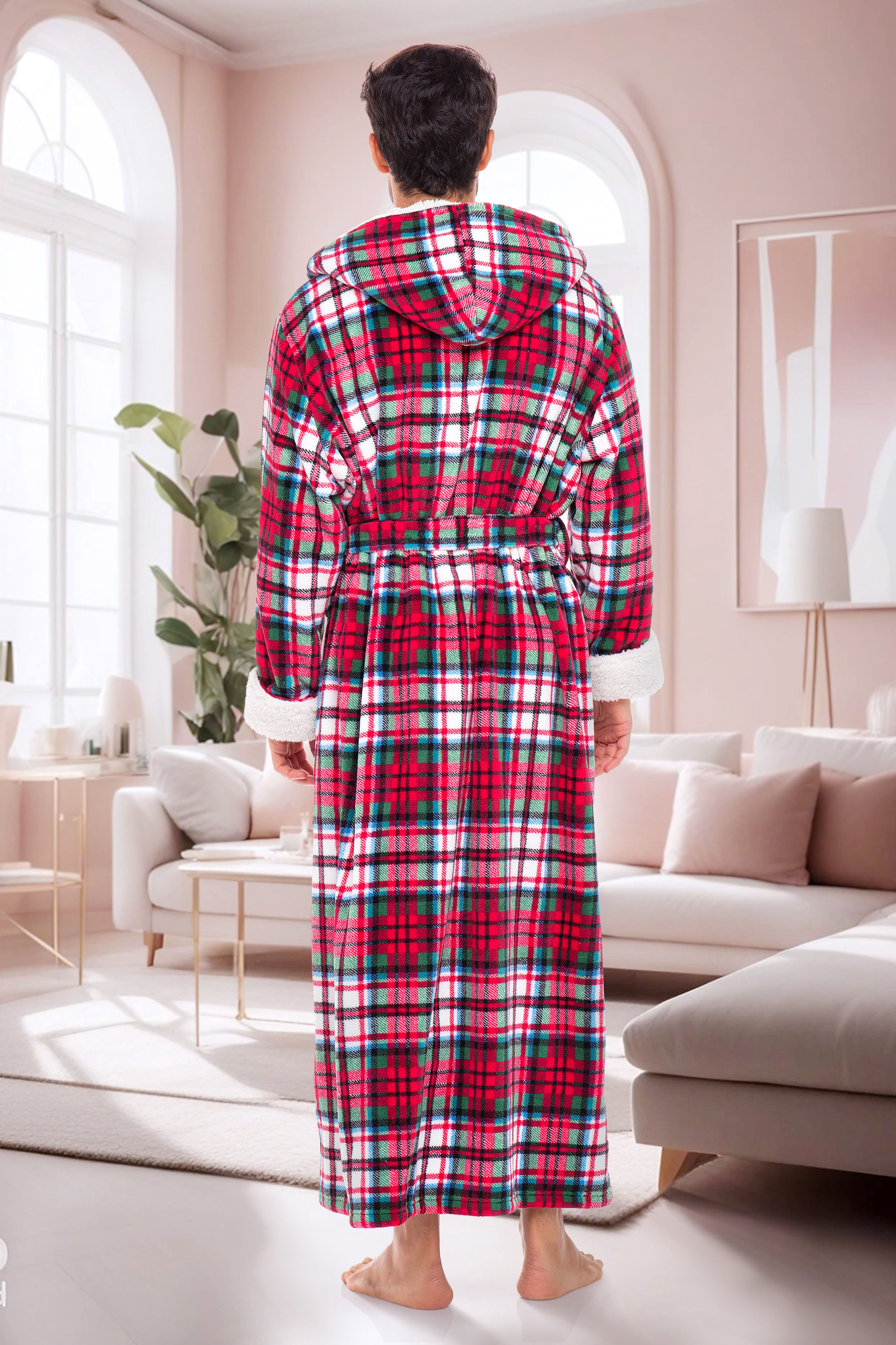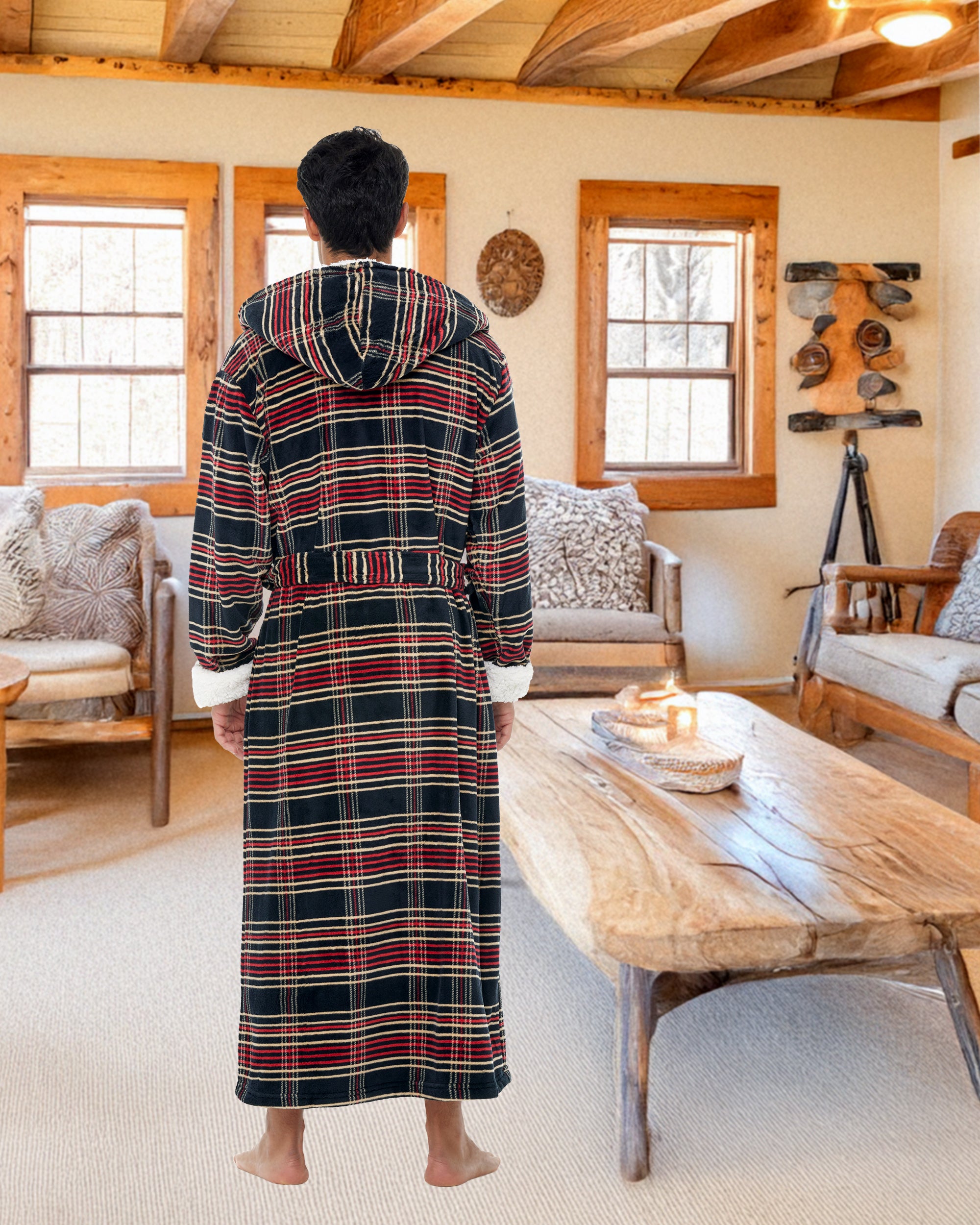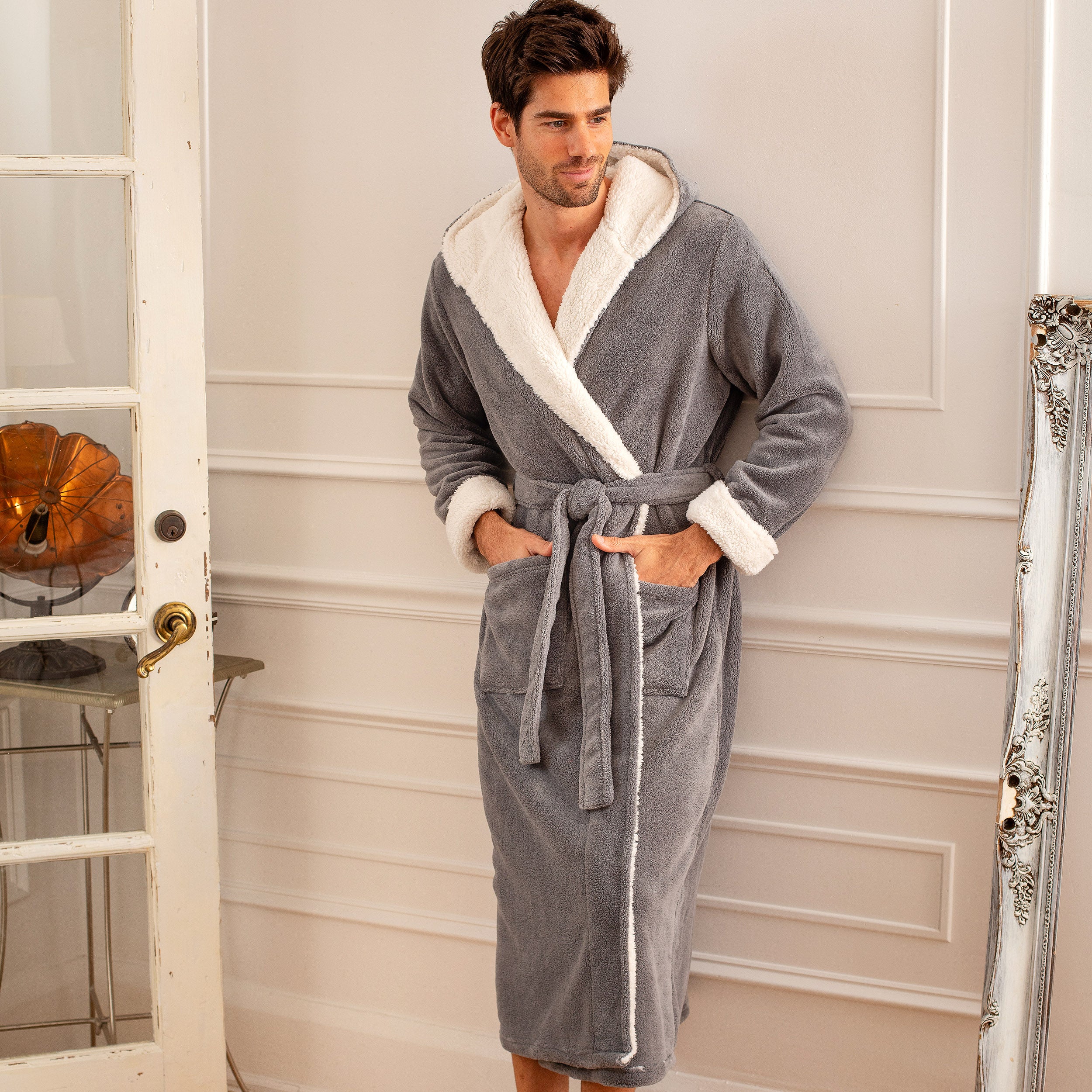 Men’s Long Hooded Sherpa Robe, Hooded Big and Tall Plush Fleece Hoodie Bathrobe