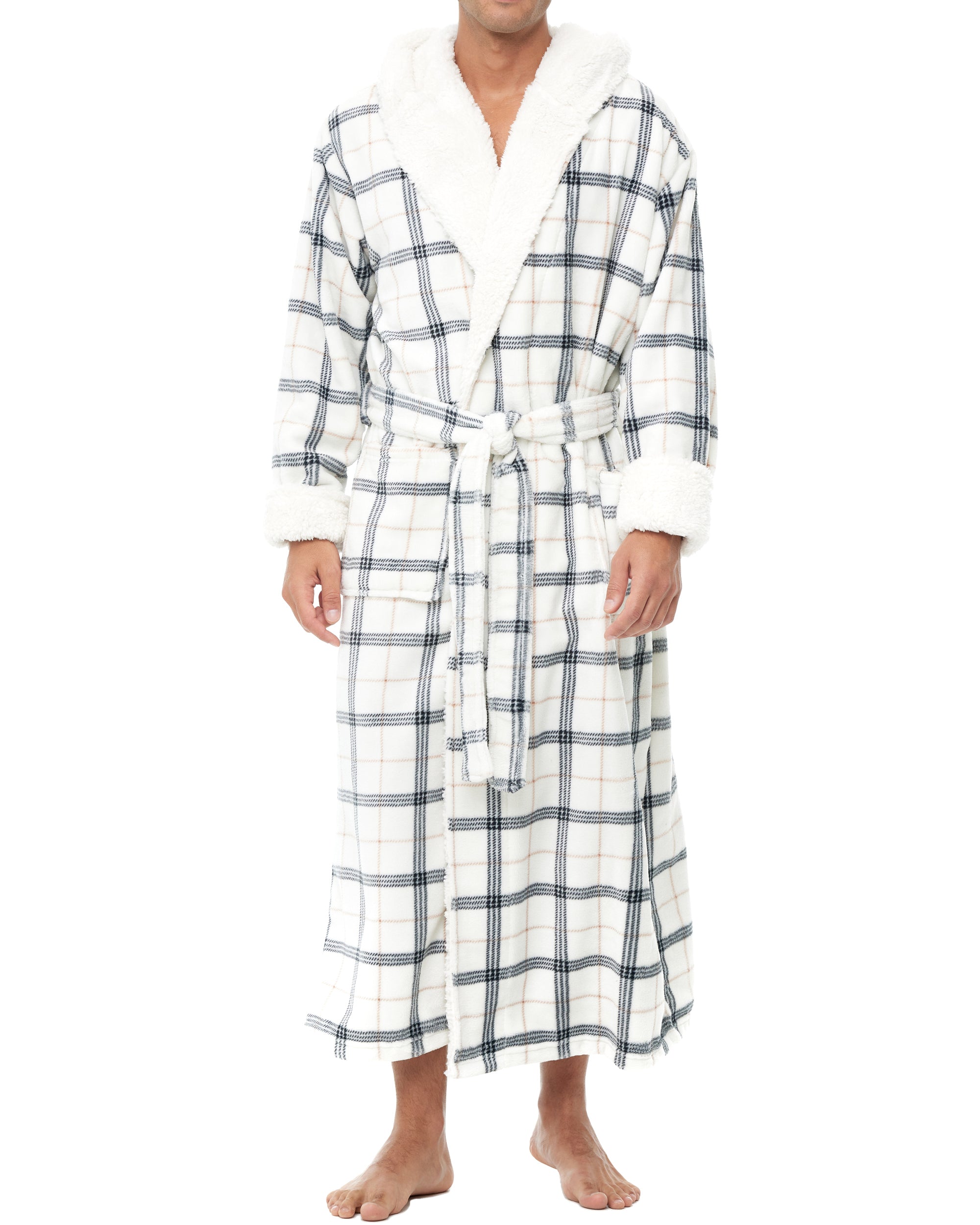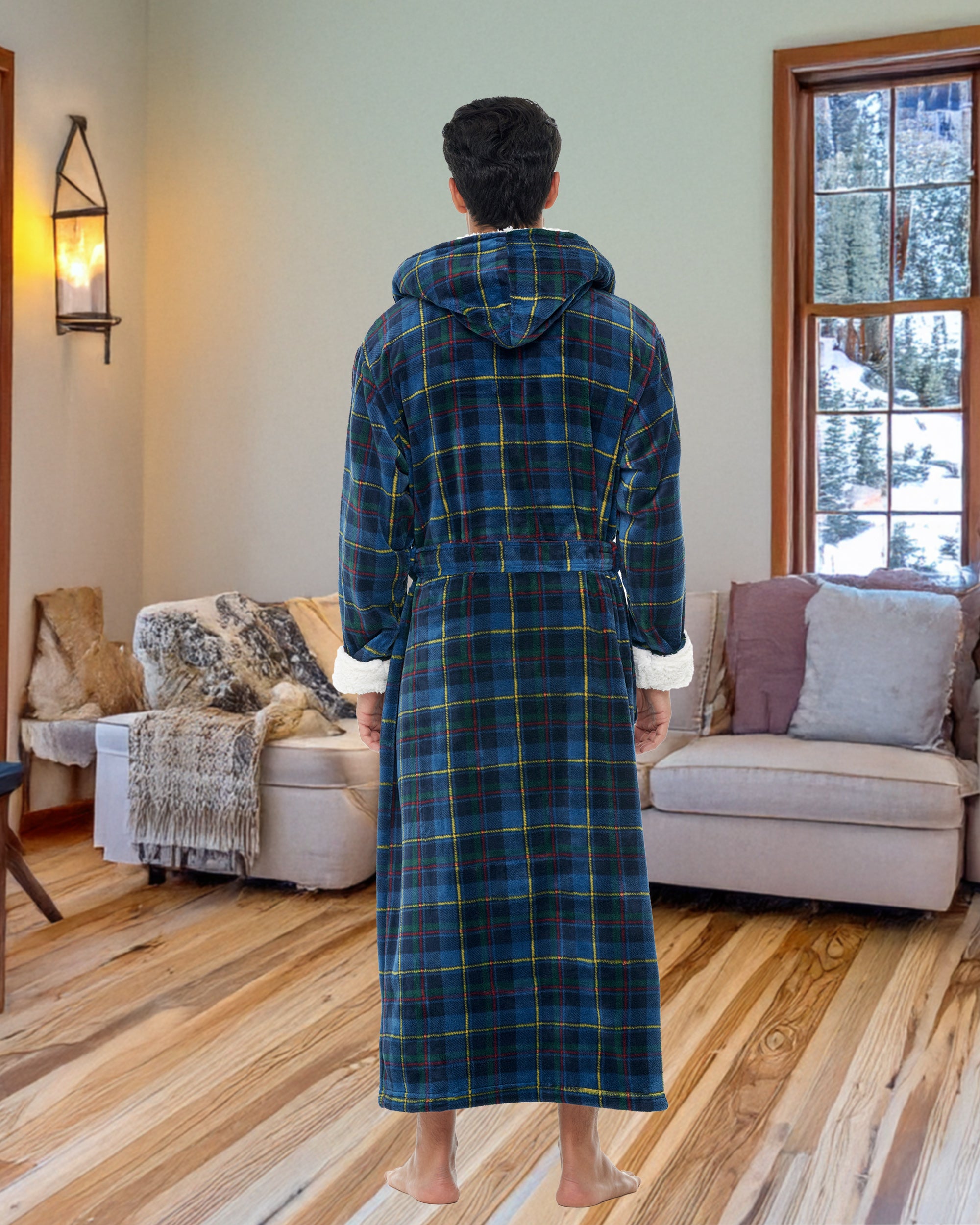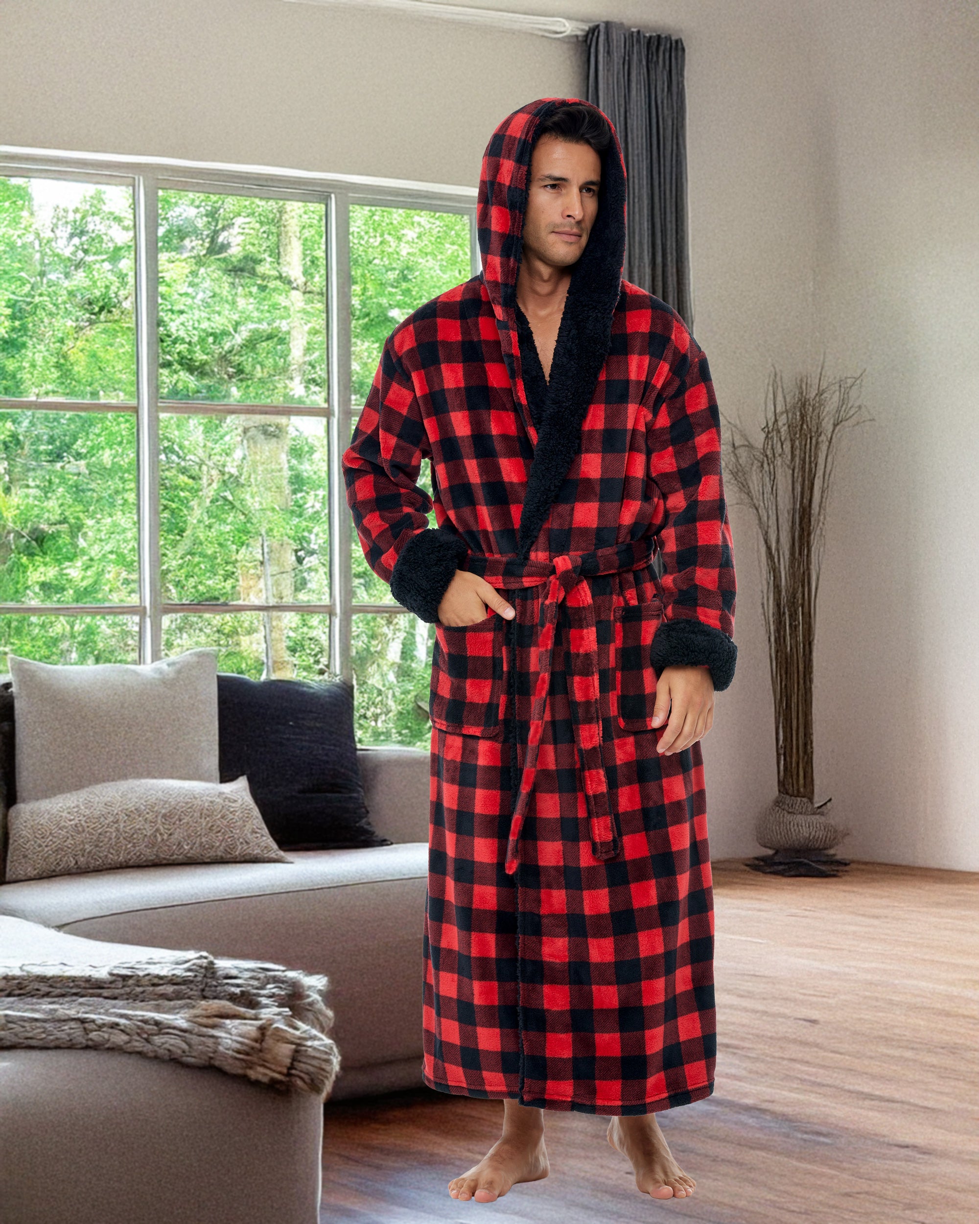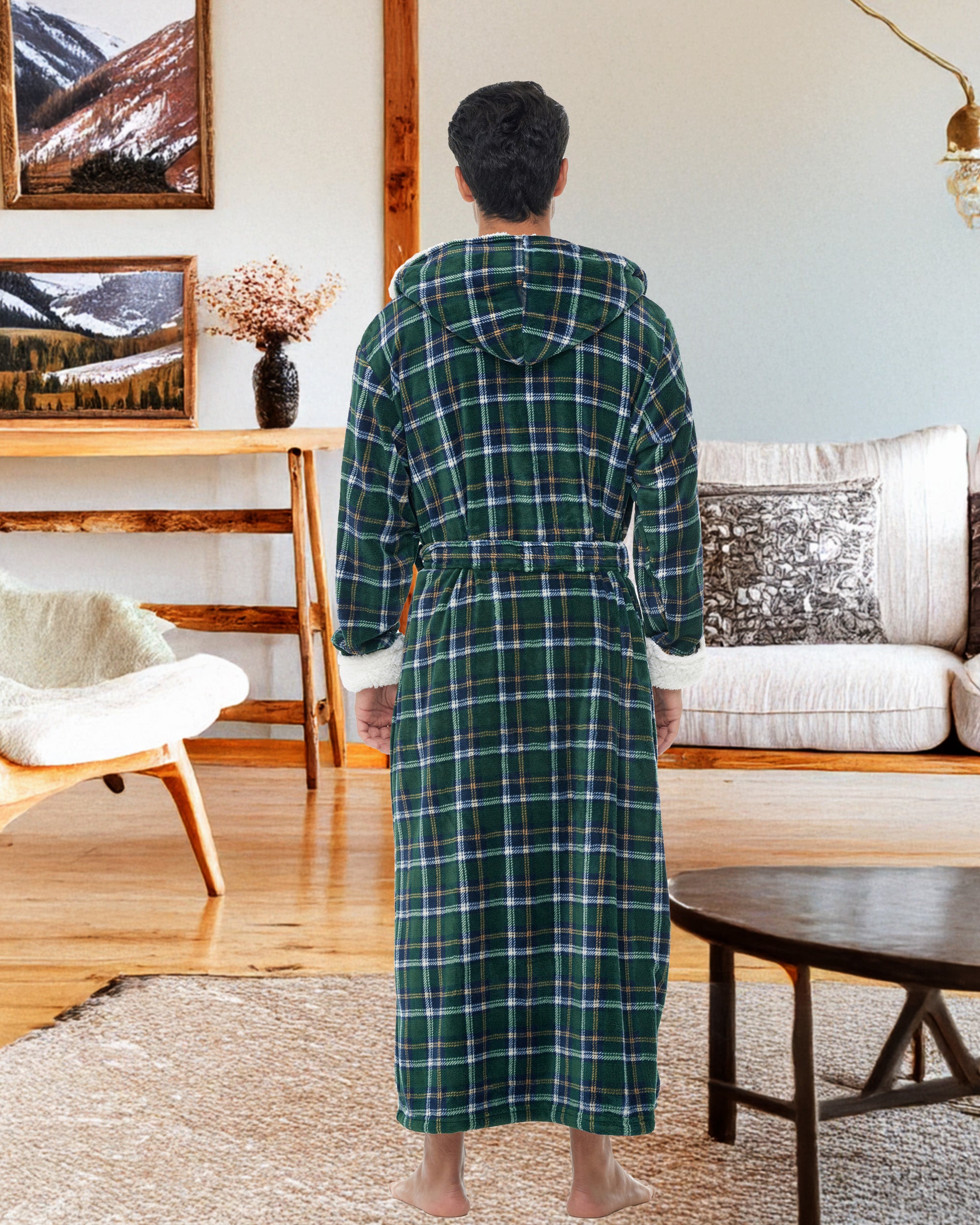 Men’s Long Hooded Sherpa Robe, Hooded Big and Tall Plush Fleece Hoodie Bathrobe