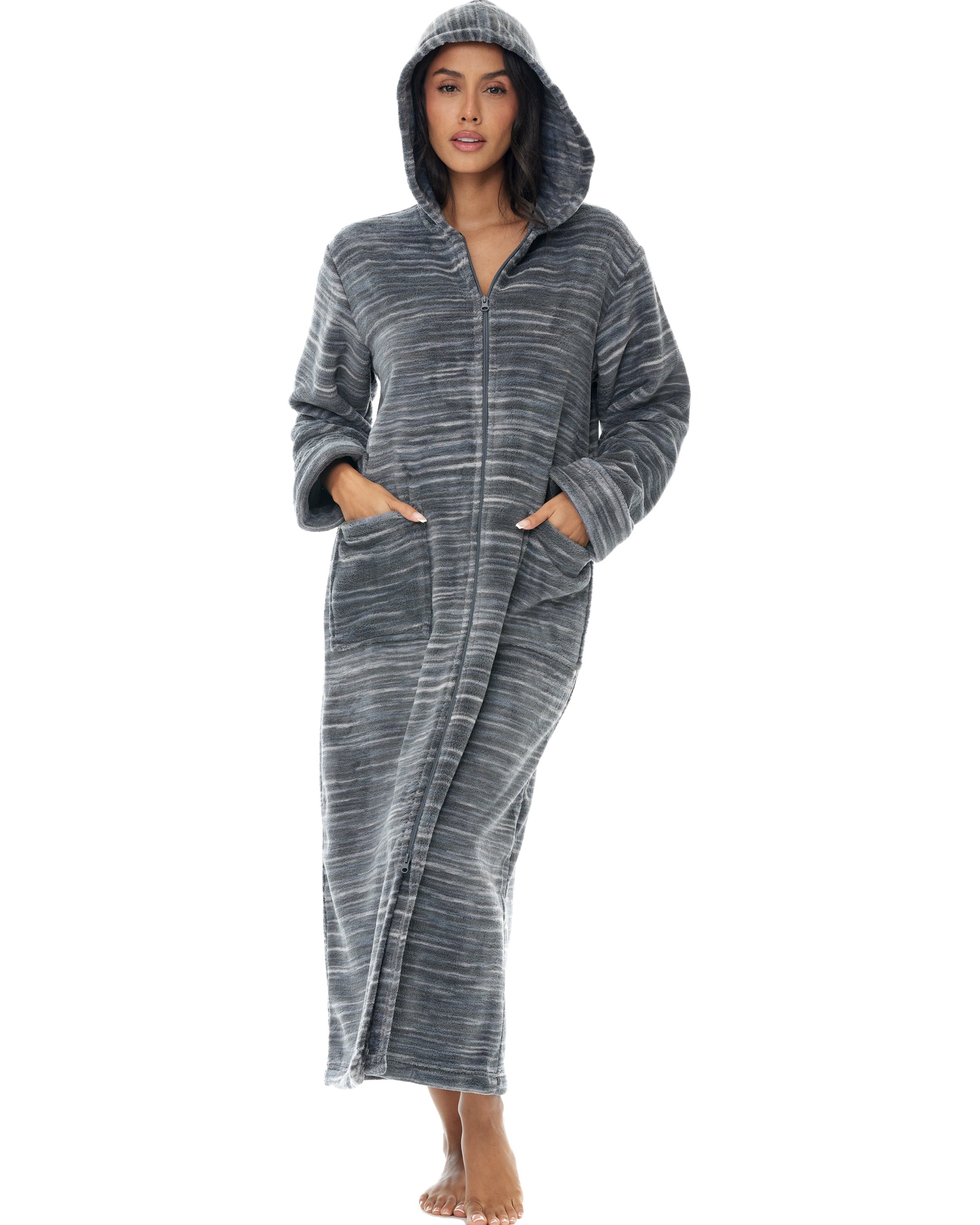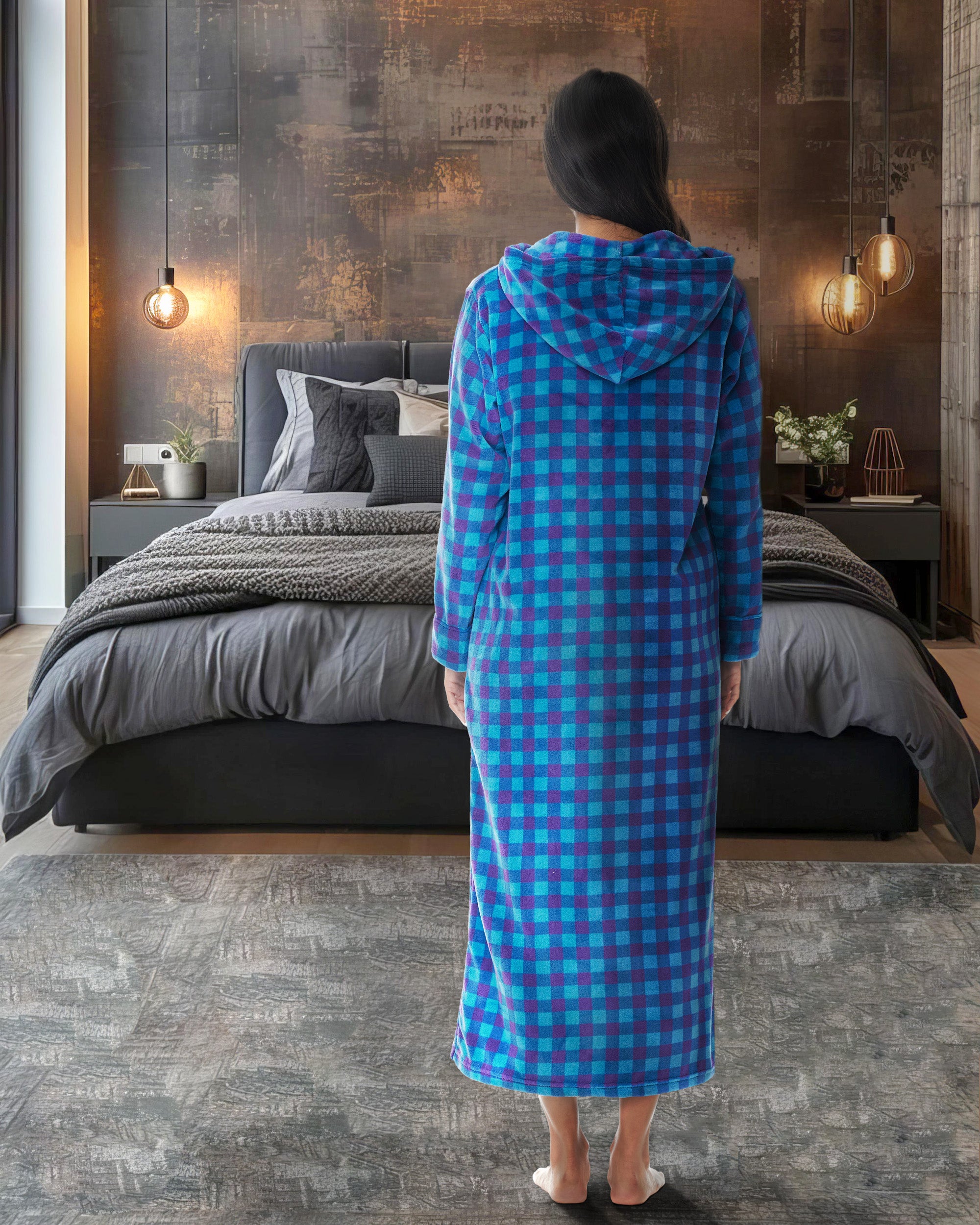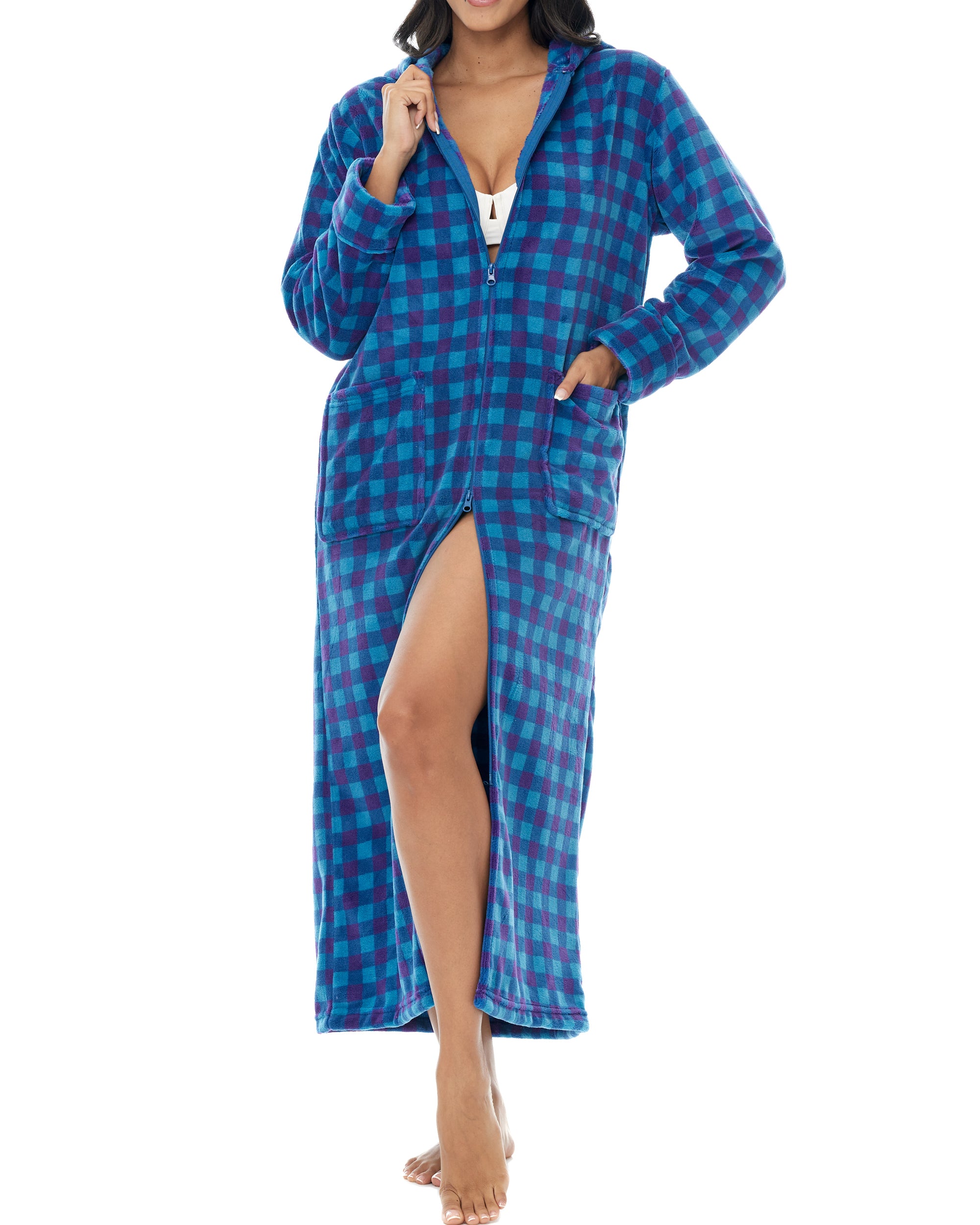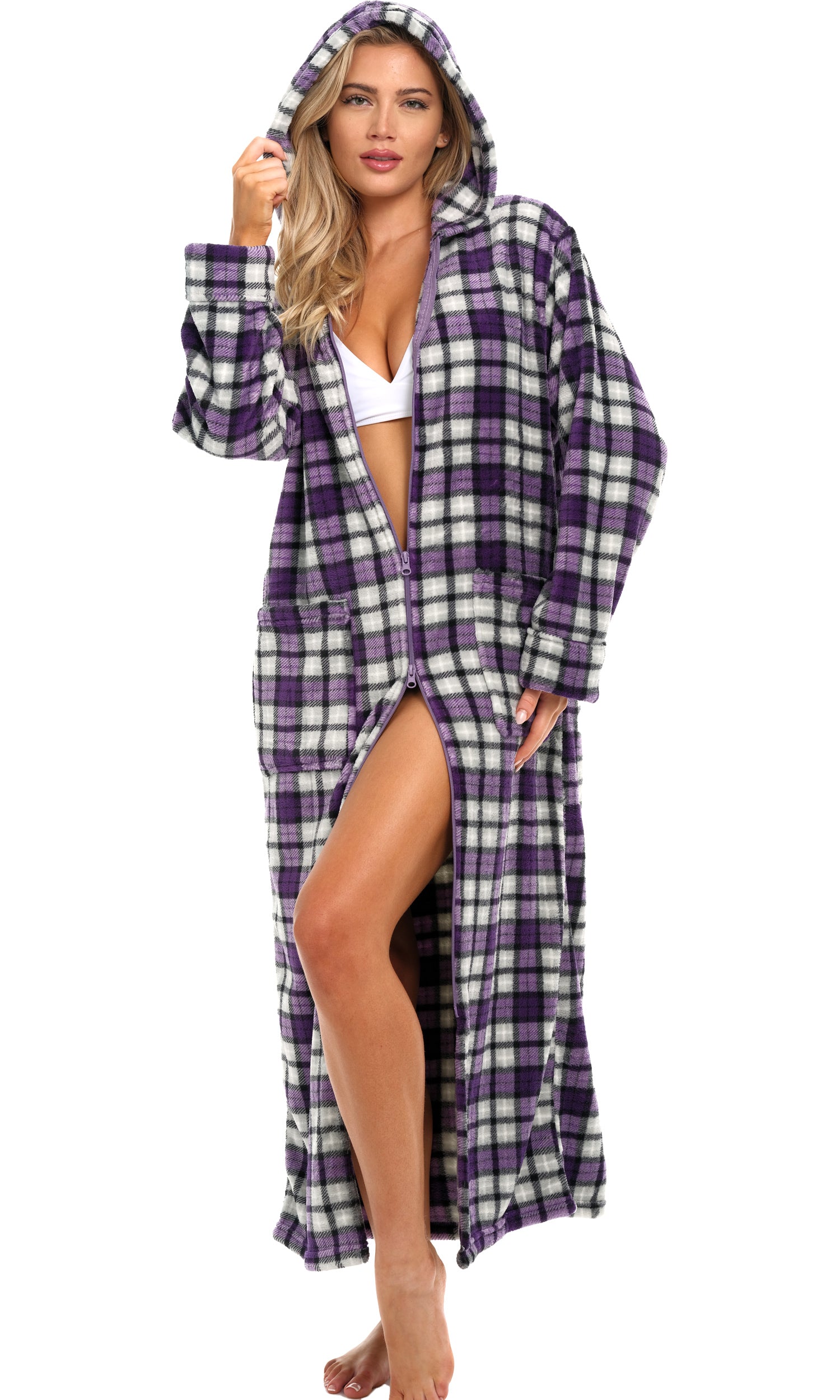 Women's Zip Up Fleece Robe with Hood, Oversized Hooded Bathrobe with Two Way Zipper