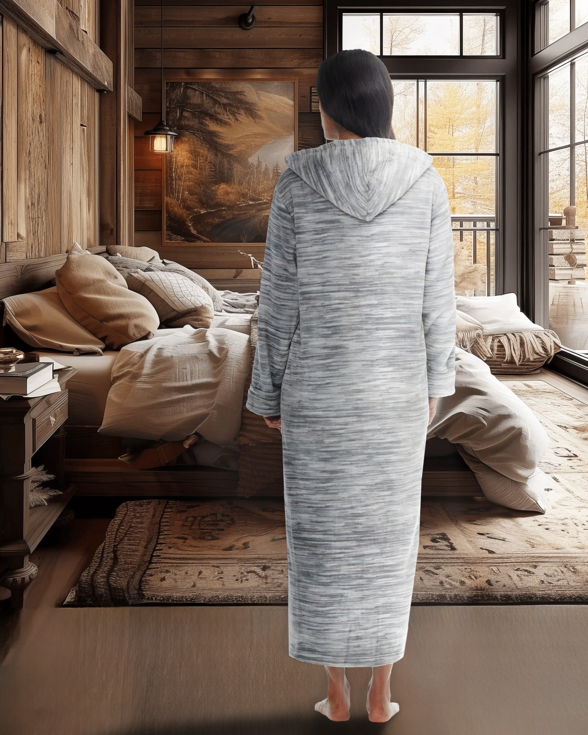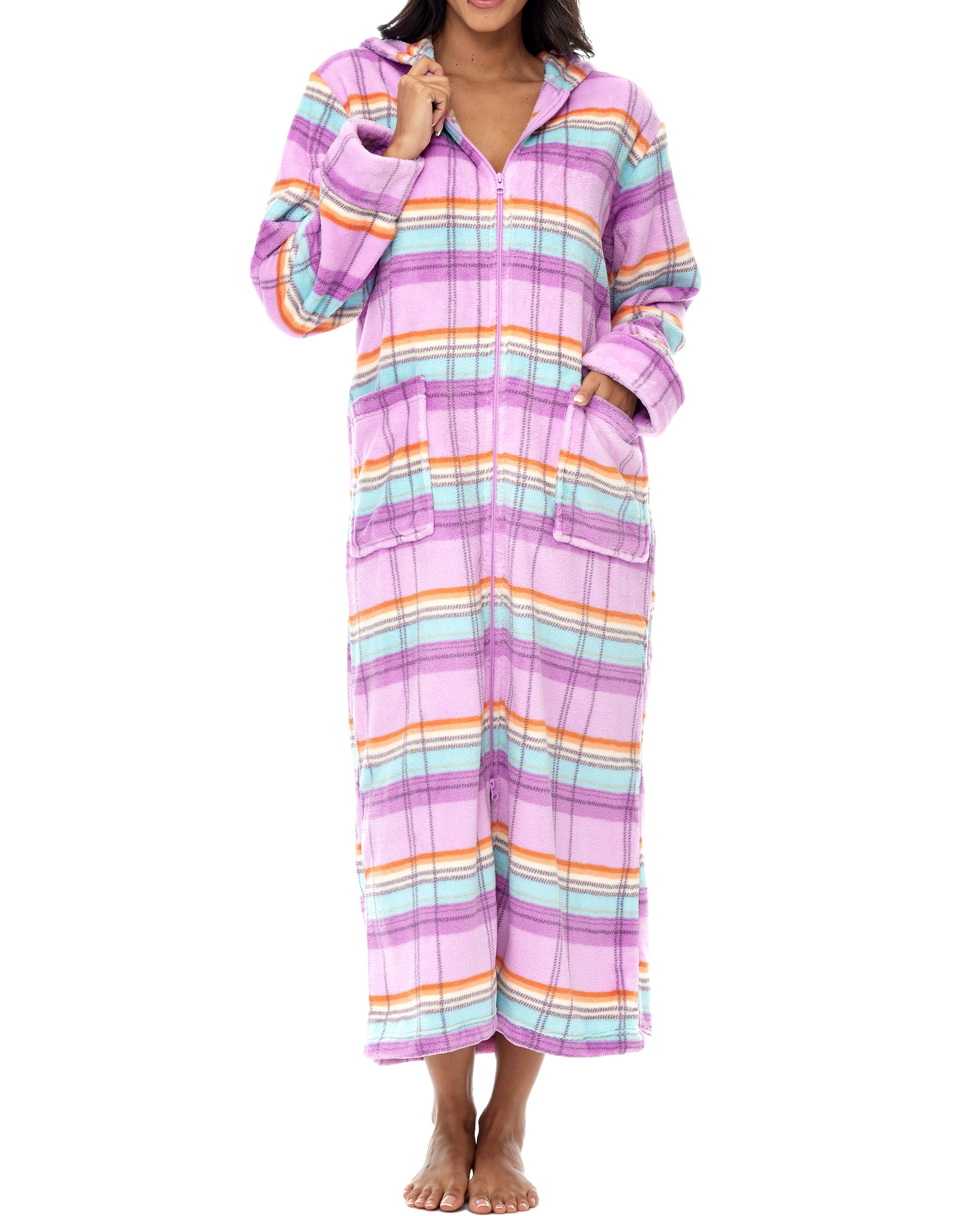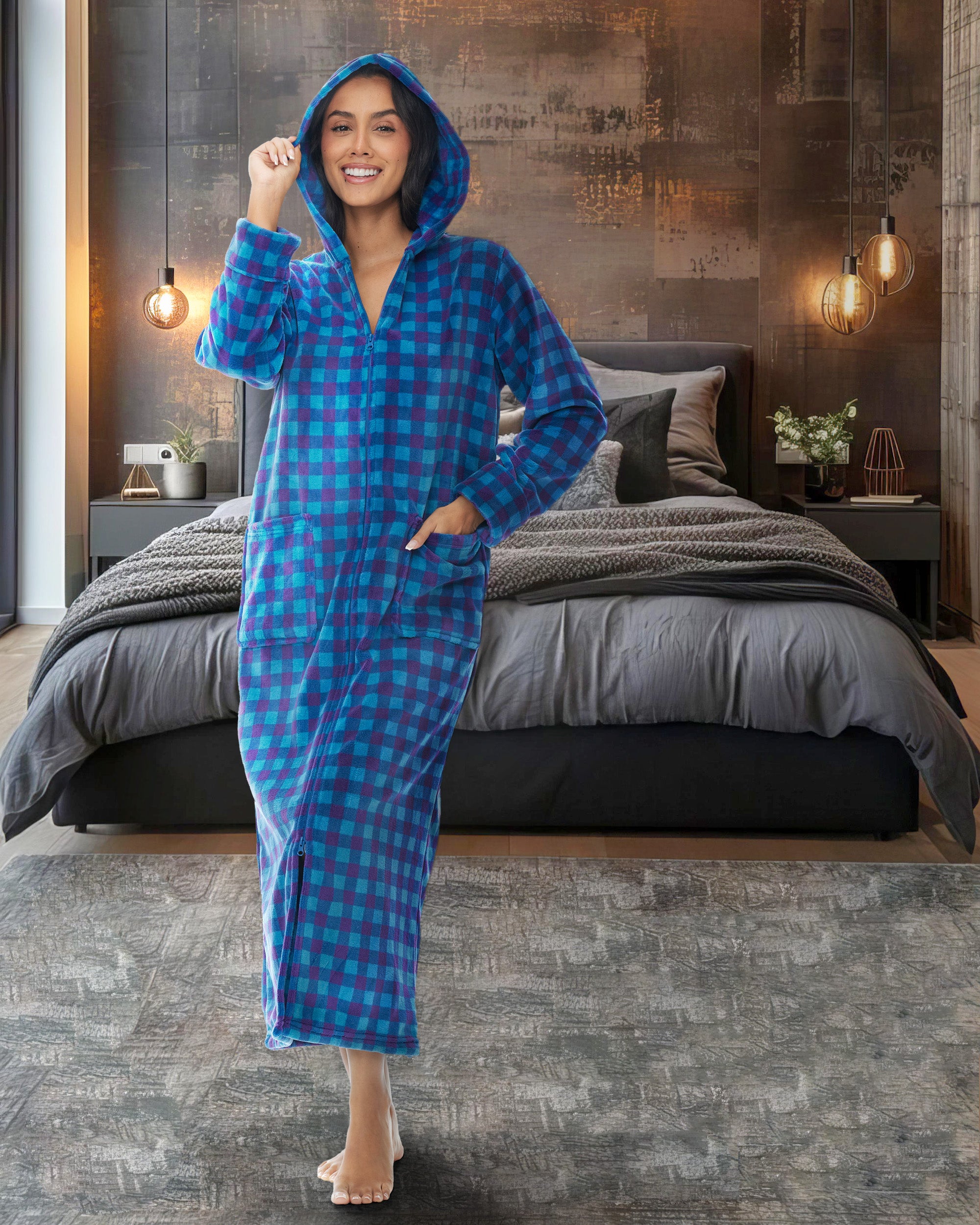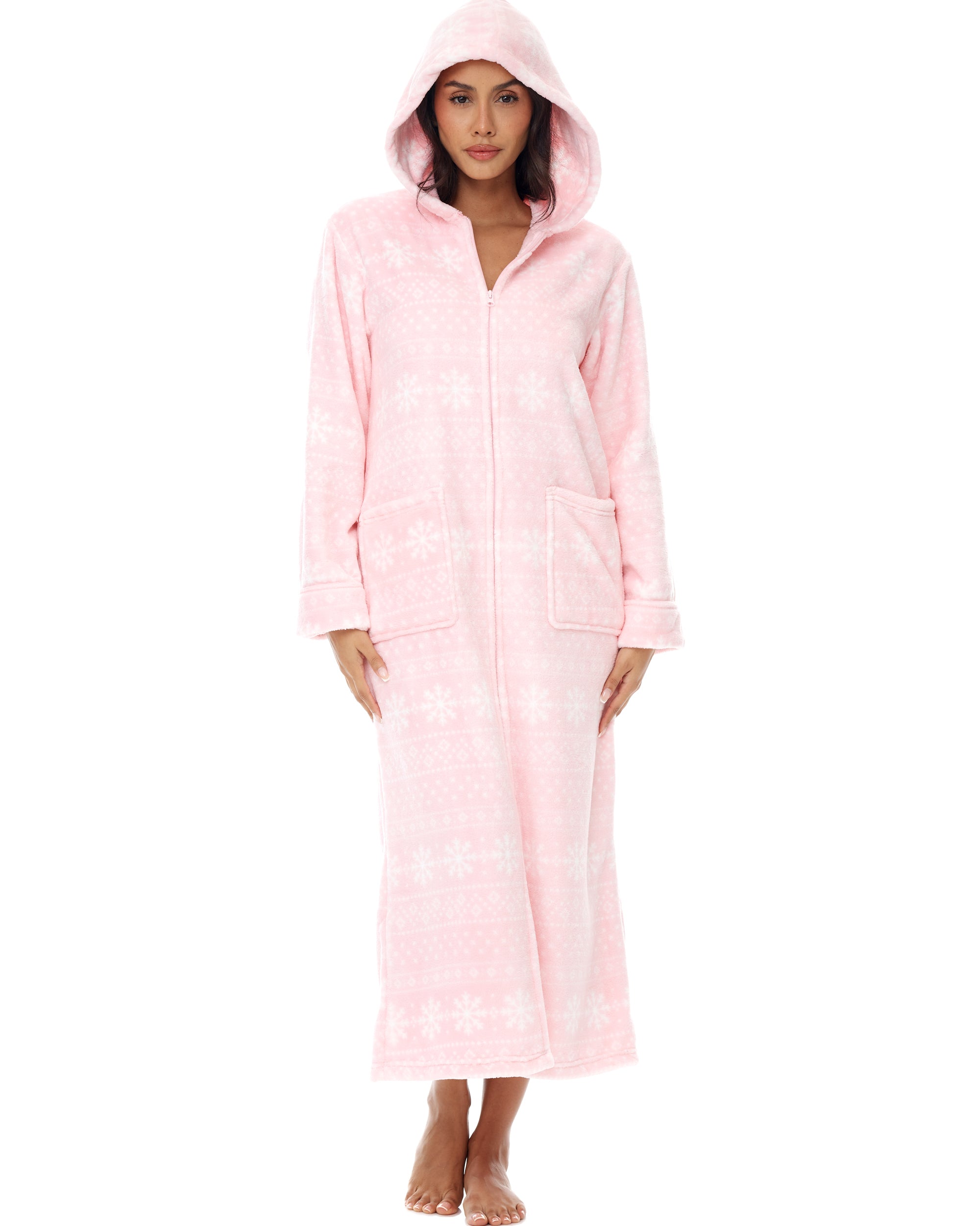 Women's Zip Up Fleece Robe with Hood, Oversized Hooded Bathrobe with Two Way Zipper
